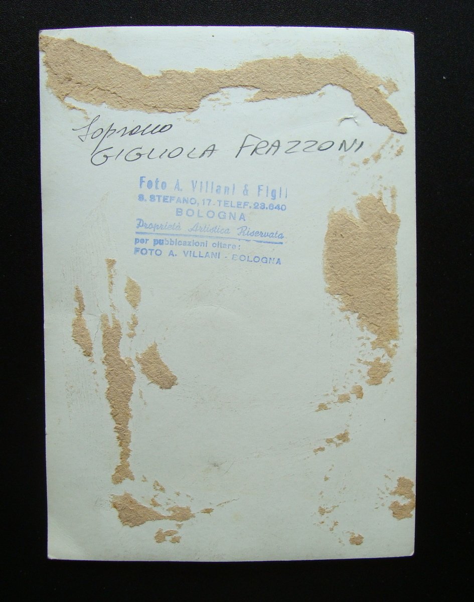 Grande Fotografia autografa, Gigliola Frazzoni Fotografia originale con firma autografa Foto Botti e Pincelli, Modena; cm 18x12,5, grande fotografia originale in b/n, con firma autografa; retro con timbro del fotografo. Condizioni di conservazione: Esemplare in buone condizioni con tracce d'uso, angoli e margini con minuscoli difetti, retro tracce di precedente inserimento dell'esemplare in album. SC03.D4884 blu
