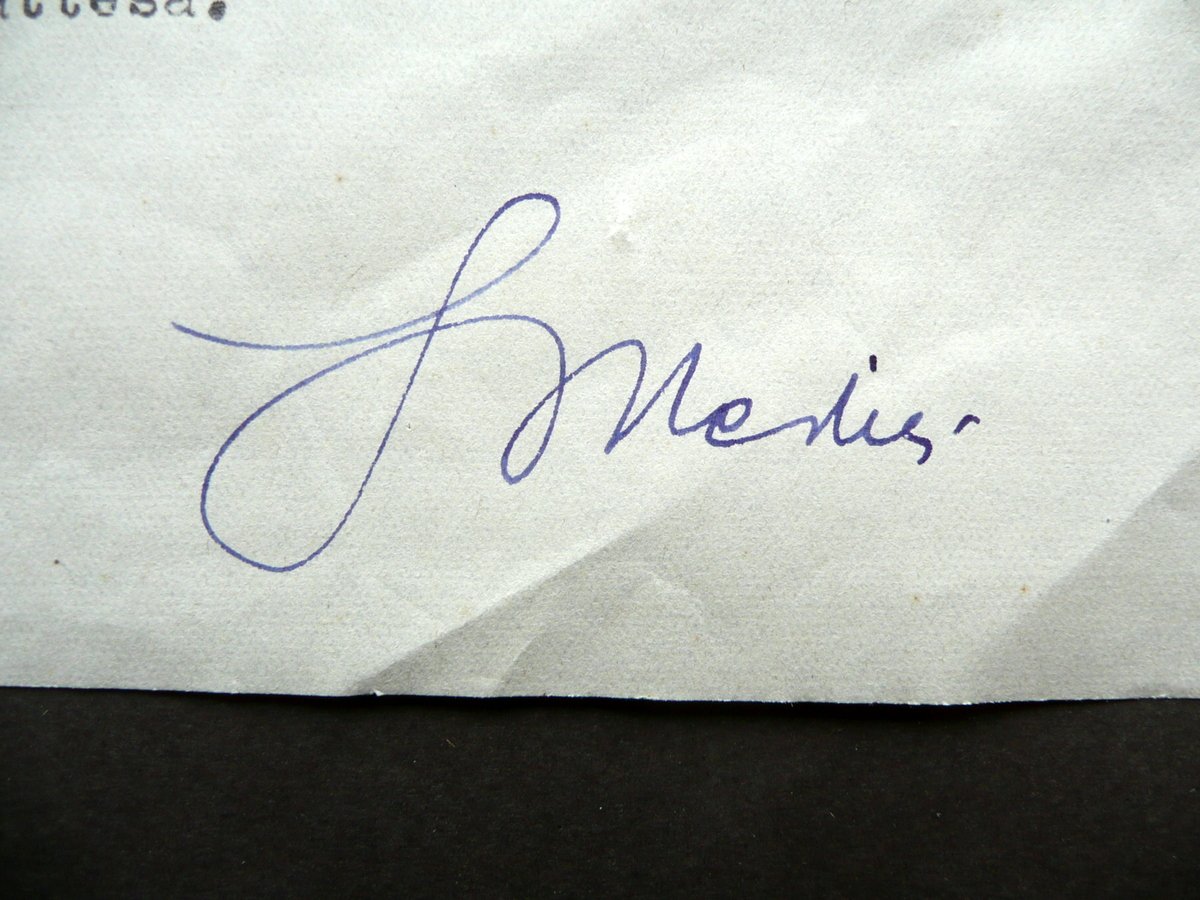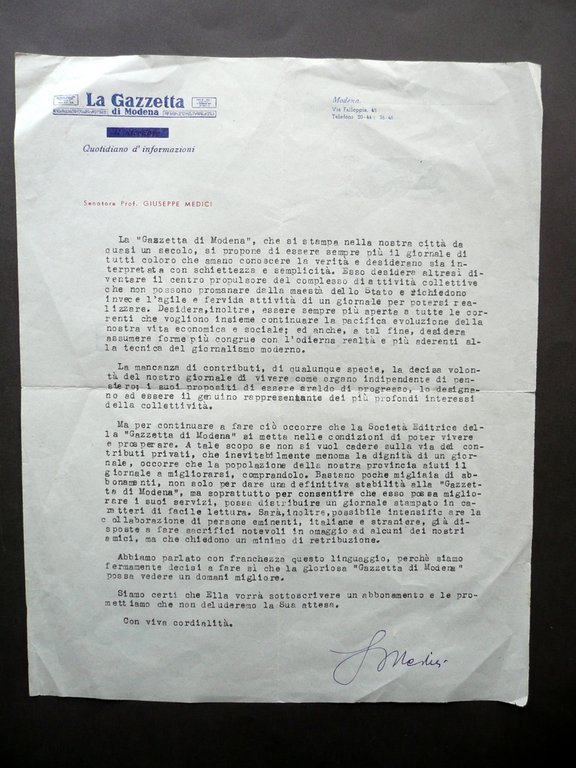 Lettera con firma autografa, Giuseppe Medici Lettera dattiloscritta con firma autografa S. d.; lettera dattiloscritta su foglio con intestazione de La Gazzetta di Modena - quotidiano d'informazioni"; testo disposto ad un unico lato, con firma autografa a penna blu al termine del testo (vedi foto). Cm 29x23. Condizioni di conservazione Esemplare ben conservato con tracce d'uso, pieghe di conservazione, lievi tracce di pieghe / pieghette agli angoli. Parte sup. del retro con una leggera abrasione dovuta a rimozione di etichetta precedentemente applicata (vedi foto). SC03.D12440 N "