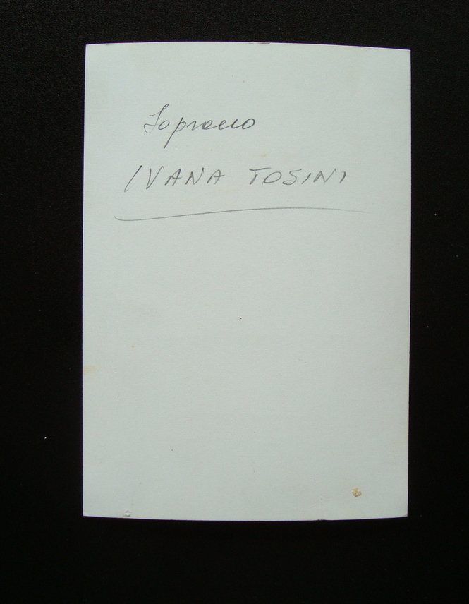 Fotografia autografa, Ivana Tosini Fotografia originale con dedica e firma autografe Foto Villani,1961, cm 15x10, fotografia originale in b/n con dedica e firma autografe;retro con annotazioni a matita rimovibili del precedente collezionista (vedi foto). Condizioni di conservazione: Esemplare in buone condizioni con leggere tracce d'uso. SC03.D4903 blu