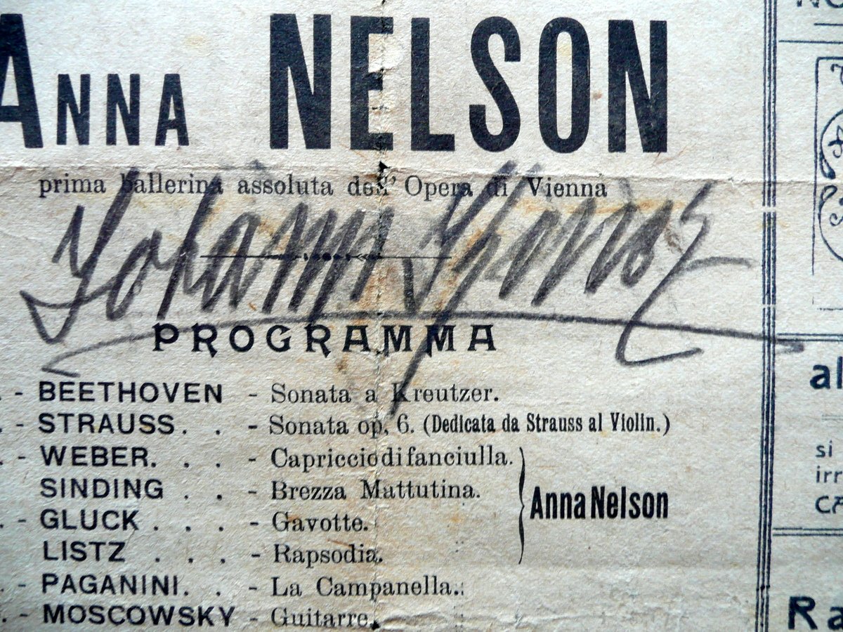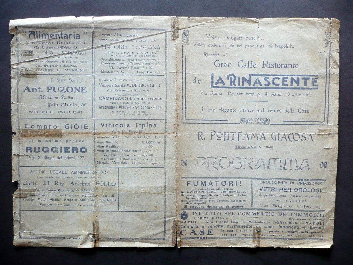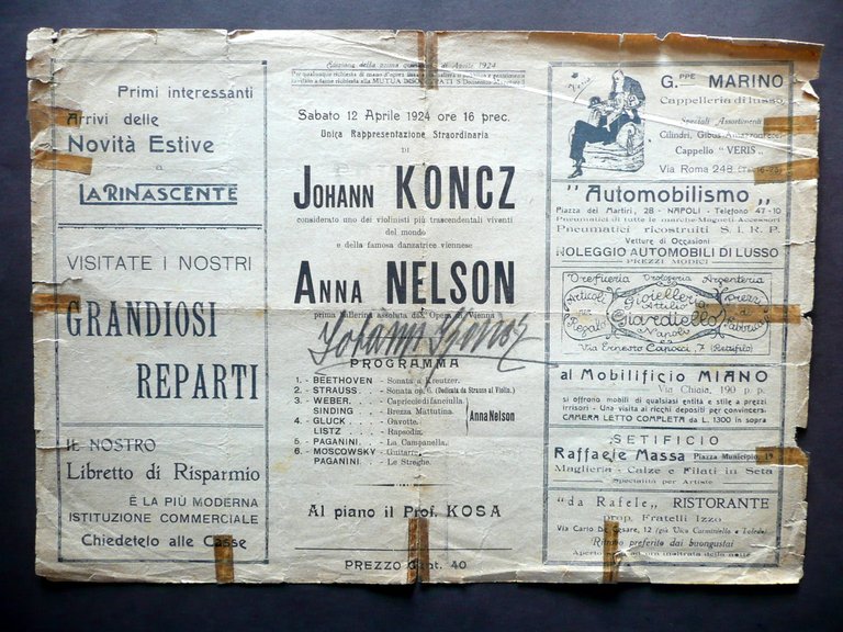 Programma con firma autografa, Johann Koncz Firma autografa su programma di concerto R. Politeama Giacosa - Napoli Sabato 12 aprile 1924, ore 16 precise 1924; programma a stampa di concerto su bifolio in carta, con firma autografa a matita alla parte centrale (vedi foto). Presenti numerose inserzioni pubblicitarie d'epoca in b/n. Cm 24,5x35. Condizioni di conservazione Programma in discrete condizioini con tracce d'uso, pieghe di conservazione, alcune piccole lievi bruniure; margini e angoli con alcuni piccoli difetti e strappetti, questi ultimi in parte oggetto di vecchio restauro con nastro adesivo (vedi foto); qualche traccia di piega / pieghetta. SC03.D12869 N