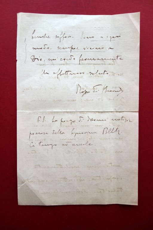 Lettera autografa, Pier Maria Rosso di San Secondo (1887-1956) lettera autografa firmata datata 25 settembre 1933 Lettera autografa firmata su foglio in carta intestata de Regoledo - casa di cura, di convalescenza e di riposo; testo ad entrambi i lati, con firma autografa al termine del testo; cm 22x14. Condizioni di conservazione Esemplare in buone condizioni con leggere tracce d'uso, normali pieghe di spedizione. Angoli con lievi tracce di pieghette. Bel contenuto personale: [.] Io, d'altro canto, sono assolutamente impratico; addirittura infantile talvolta. Non mi lamento, sebbene soffra. Sono, a ogni modo, sempre vicino a Dio, cui credo fermamente. [.]". SC03.D16166 N "