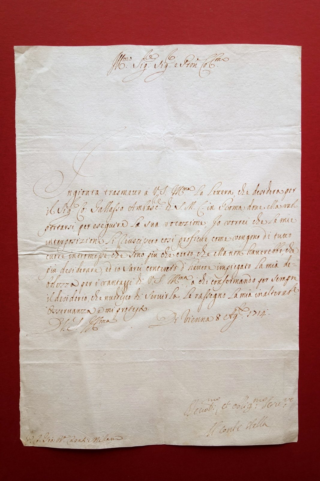 Autografo Stella Rocco Conte Nobile Lettera Vienna 1714 Modugno Militare