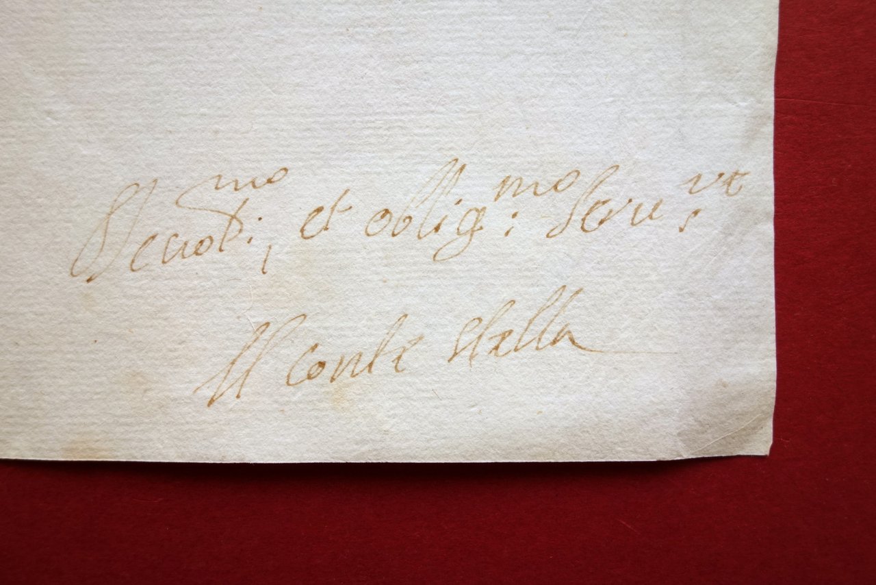 Lettera con sottoscrizione e firma autografa, Conte Stella Rocco (1662-1720) lettera con firma e sottoscrizione autografa datata Vienna, 8 agosto 1714 Lettera di mano segretariale, con firma e sottoscrizione autografe, redatta su foglio in carta; testo ad un'unica facciata, con firma e sottoscrizione al margine inf. della stella (vedi foto). Retro bianco. Cm 29,5x21. Condizioni di conservazione Esemplare in buone condizioni con tracce d'uso, lievi pieghe di conservazione e minime tracce di pieghe. Tre margini lievemente rifilati. Per maggiori dettagli vedi foto. Il Conte Stella Rocco, originario di Modugno, dovette gran parte della sua fortuna alle doti militari che seppe dimostrare in numerose occasioni sotto l'imperatore asburgico. Tali doti gli valsero l'introduzione e la vicinanza alla corte e agli stessi imperatori, che lo ricompensarono con numerosi terreni, titoli, privilegi. Si allega breve biografia. SC03.D17399 N