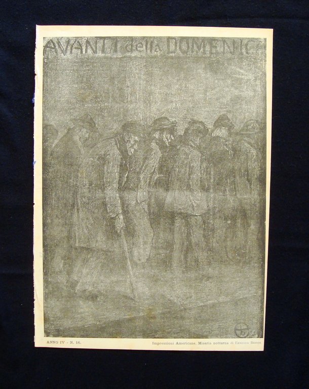 Periodico, Avanti della Domenica" Anno IV- Numero 16 21 aprile 1906 Tip.Industria e Lavoro, Roma, 1906; cm 34x25, pp. 12; Rivista settimanale con 1 ill. fot. b/n. Illustrazione di copertina "Miseria Notturna" di Ernesto Biondi. Numero completo. Condizioni di conservazione Esemplare in buone condizioni con leggere tracce del tempo, dorso con minimi difetti e mancanze proveniente da volume rilegato, per le condizioni vedi foto. Numero completo. Una delle riviste illustrate pi√π interessanti di quel primo decennio del Novecento. SC03.D4948F blu "