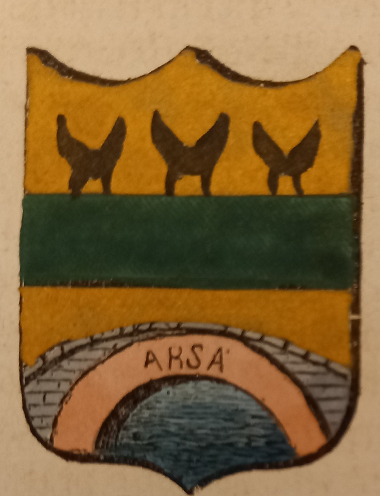 Piccolo stemma comunale colorato a mano d’epoca (cm. 3,8 x 3,2 ca.). Stralcio dal Dizionario Corografico illustrato dell’Italia, edito a Milano nel 1868. Ogni stemma di questa raccolta è inserito in una o più pagine di testo con la descrizione della località, notizie storico - geografiche e statistiche (numero degli abitanti e degli elettori, guarnigioni della Guardia Nazionale, ecc.). Spesso il testo è redatto da studiosi locali o dai sindaci, con maggiori, interessanti notizie.