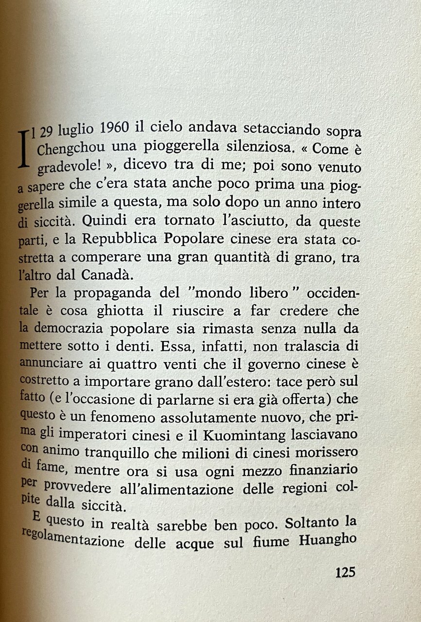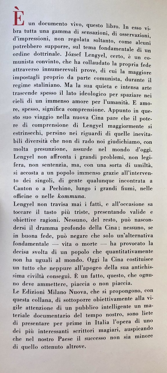 È un documento vivo, questo libro. In esso vibra tutta una gamma di sensazioni, di osservazioni, d'impressioni, non regolata soltanto, come alcuni potrebbero supporre, sul tema fondamentale di un ordine dottrinale. József Lengyel, certo, è un comunista convinto, che ha collaudato la propria fede attraverso innumerevoli prove, di cui la maggiore impostagli proprio da parte comunista, durante il regime staliniano. Ma la sua quieta e intensa arte trascende spesso il lato ideologico per spaziare nei cieli di un immenso amore per l'umanità. E amore, spesso, significa comprensione. Appunto in questo suo viaggio nella nuova Cina pare che il potere di comprensione di Lengyel maggiormente si estrinsechi, persino nei riguardi di quelle inevitabili diversità che non di rado noi giudichiamo, con molta presunzione, assurde nel mondo d'oggi. Lengyel non affronta i grandi problemi, non legifera, non sentenzia, ma, con una sorta di umiltà, si accosta a un popolo immenso grazie all'intervento dei singoli, di gente qualunque incontrata a Canton o a Pechino, lungo i grandi fiumi, nelle officine o nelle kommuna. Lengyel non travisa mai i fatti, e all'occasione sa toccare il tasto più triste, presentando valide e obiettive ragioni. Nessuno, del resto, può nascondersi il dramma profondo della Cina nessuno, se in buona fede, può negare che solo un'alternativa fondamentale vita o morte ha provocato la decisa svolta di un popolo che quantitativamente non ha uguali al mondo. Oggi la Cina costituisce un tutto che neppure all'apogeo della sua antichissima civiltà consegui. È un fatto, questo, che ognuno deve ammettere, piaccia o non piaccia.