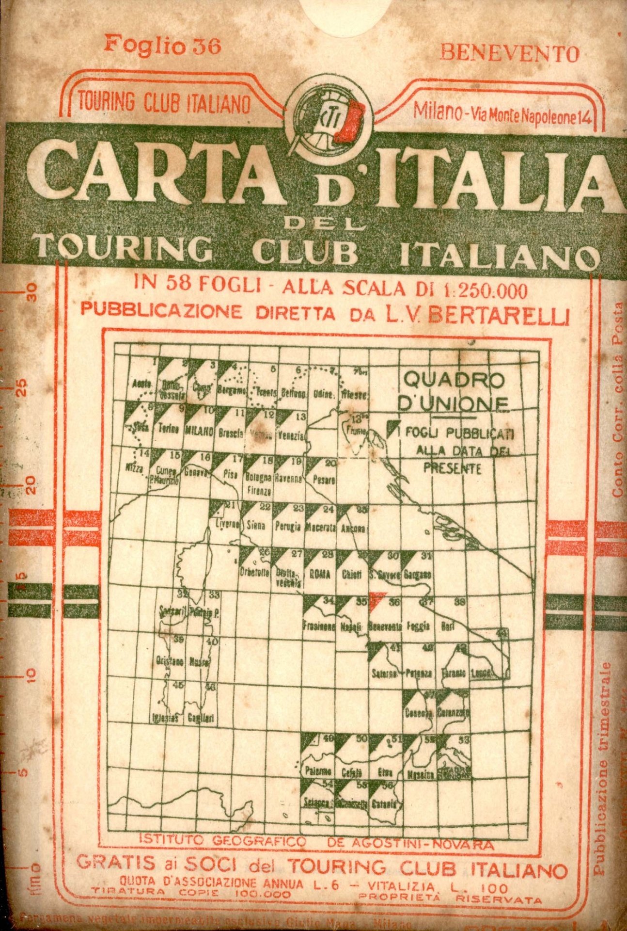 Foglio 36 - Benevento. Con custodia originale in pergamena vegetale. Allegato fascicolo con indice delle località contenute nella carta e legenda dei segni convenzionali. Stampa a colori. Scala 1:250.000. 914.5 - Ba Ottimo (Fine)