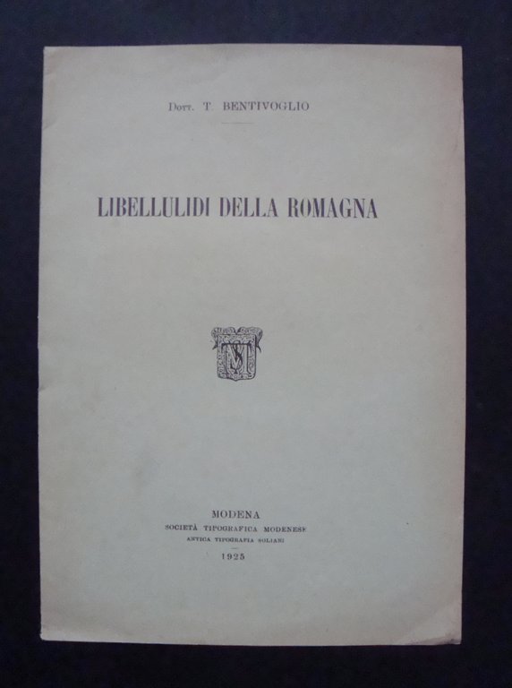 BENTIVOGLIO TITO, LIBELLULIDI DELLA ROMAGNA Soc.Tip.Modenese Antica Tip.Soliani, Modena, 1925, cm 24,5 x 17, pp. 8, br.ed. Condizioni di conservazione. Esemplare in buono stato con leggerissime tracce d'uso e del tempo MM1172.OP-196