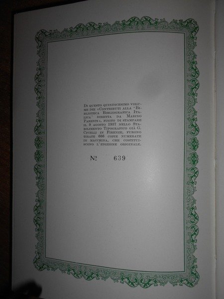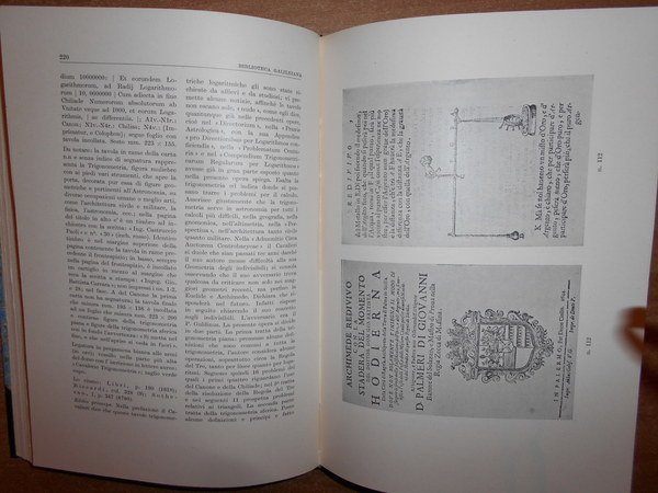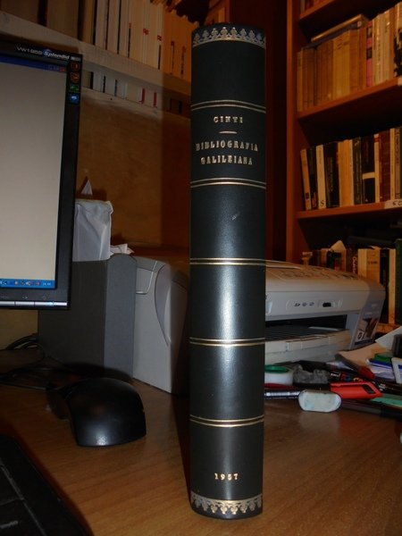 Raccolta dal Principe Giampaolo Rocco di Torrepadula Dino, Cinti. Firenze, Sansoni Antiquariato,1957. BIBLIOGRAFIA/BIBLIOTECA GALILEIANA. In-8°, m. pelle con angoli, titolo e fregi in oro al dorso, copertine originali conservate. 393, (1) pp. con numerose riproduzioni di frontespizi nel testo. Esemplare come nuovo a tiratura limitata in 666 copie numerate (n° 639). Uff. D - III - 2