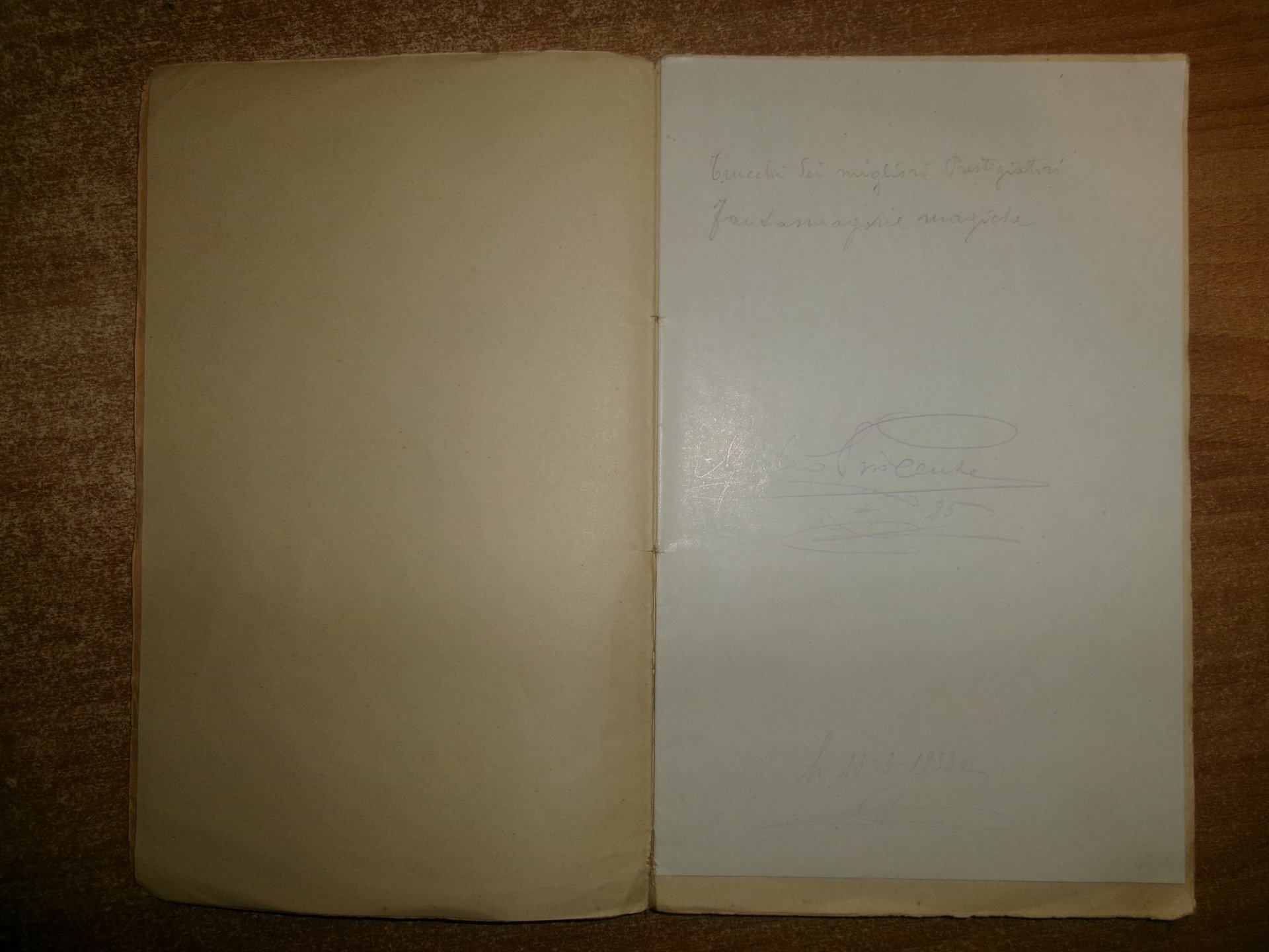 Bibliographie de la Prestidigitation Française Ancienne et Moderne. In-8°, br. orig. Pamphlet with original wrappers, 94 pages. A Bibliography of French conjuring, manipulation, illusions, mathematics, physical amusements, and more. Alcune note a matita e a penna nel margine bianco di poche pagine. Ben conservato con normali segni del tempo. Neg. fot. mob. N entro busta trasp.