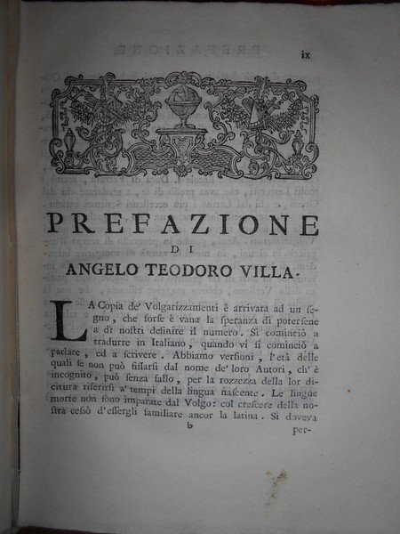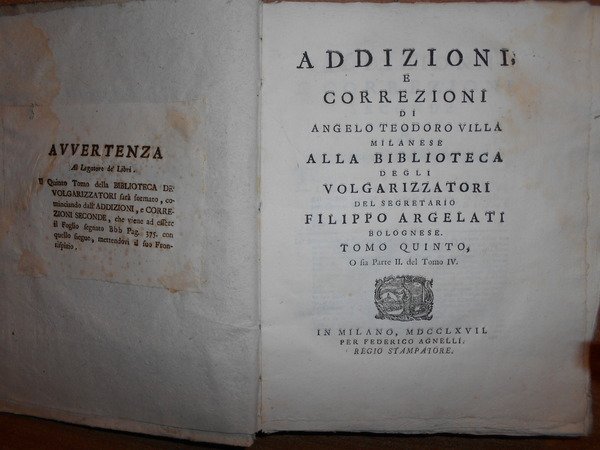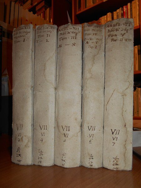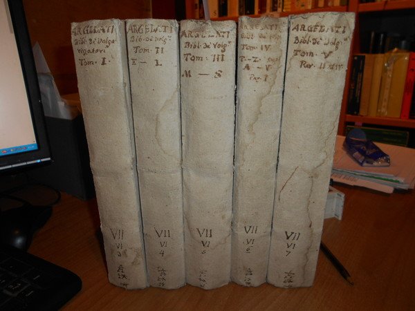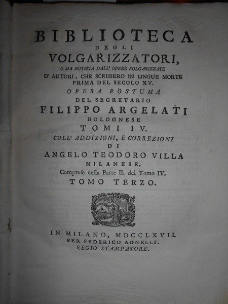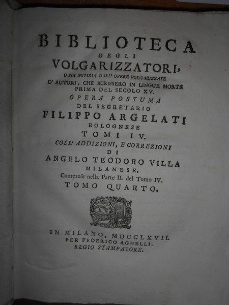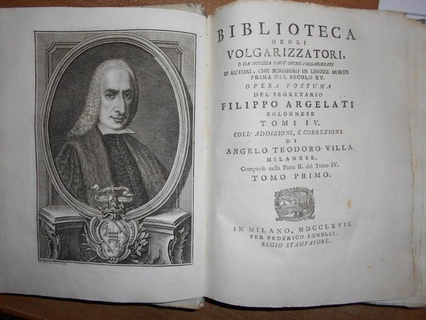 Filippo, Argelati. In Milano, per Federico Agnelli Regio Stampatore, 1767. BIBLIOTECA degli Volgarizzatori, o sia notizia dall' Opere volgarizzate d' Autori, che scrissero in lingue morte prima del secolo XV. Opera postuma. 5 tomi in-4° antico, cartonatura officinale con titoli manoscritti ai dorsi. Bel ritratto in antiporta inciso in rame nel Tomo primo: 1 f. bianco, xv, (1), 343 pp., 1 f. bianco; Tomo secondo: 1 f. bianco, (2), 352 pp., 1 f. bianco; Tomo terzo: 1 f. bianco, (2), 423, 1 f. bianco. Tomo quarto: 1 f. bianco, (2), 374, 2 ff. bianchi. Tomo quinto: 1 f. bianco con applicata (avvertenza), (2), da pagina 375 a pagina 805 (Addizioni e correzioni). Splendida serie di questa imponente e importante bibliografia del bolognese Argelati (1685-1755), pubblicata postuma, con aggiunte e correzioni di Angelo Teodoro Villa (1723-1794). Ottimo esemplare nella sua legatura originale con barbe. Uff. A - I - III