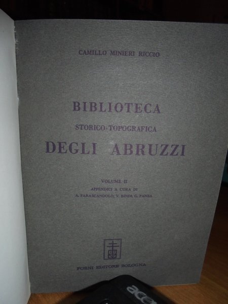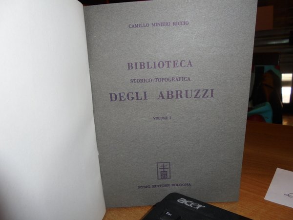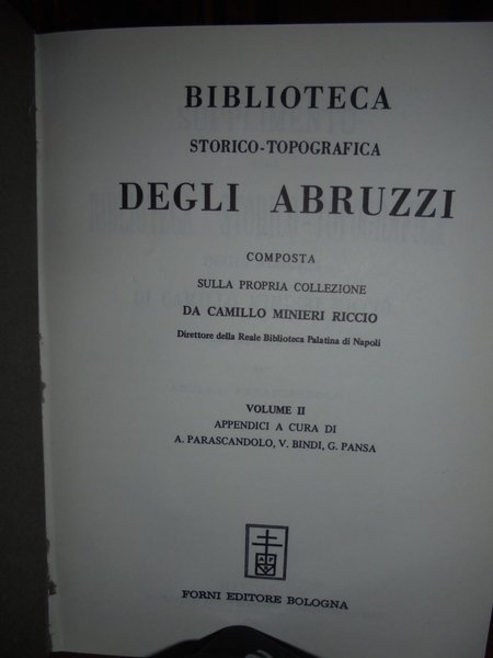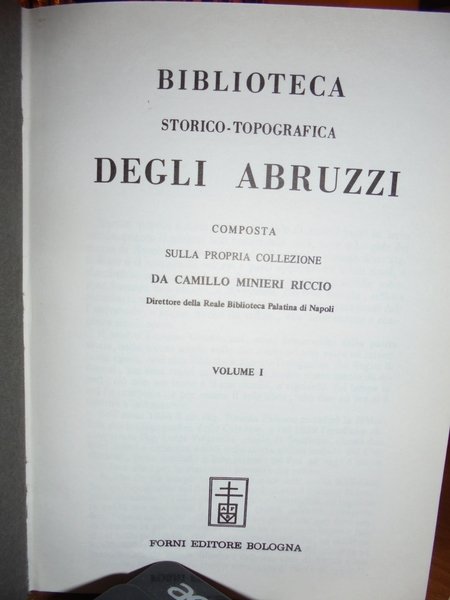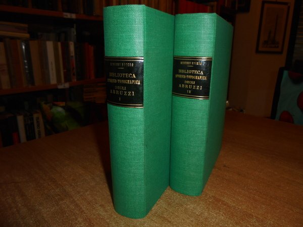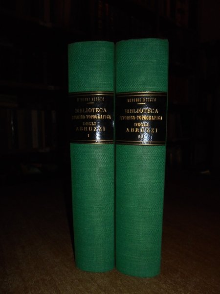 Camillo Minieri Riccio. Bologna, Forni Editore, 1968. BIBLIOTECA Storico-Topografica degli ABRUZZI composta sulla propria collezione. Ristampa anastatica dell' edizione di Napoli, 1862-91. 2 volumi in-8°, tela verde con titoli in oro ai dorsi, copertine originali conservate. Vol. I. 470 pp.; Vol. II. 137 pp.; 115 pp.; vii, 403 pp. Esemplare come nuovo in legatura recente con le copertine originali conservate. Uff. E - IV - 4 - 2