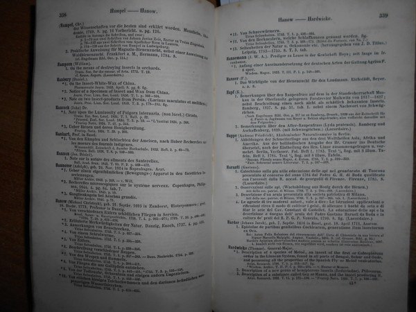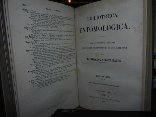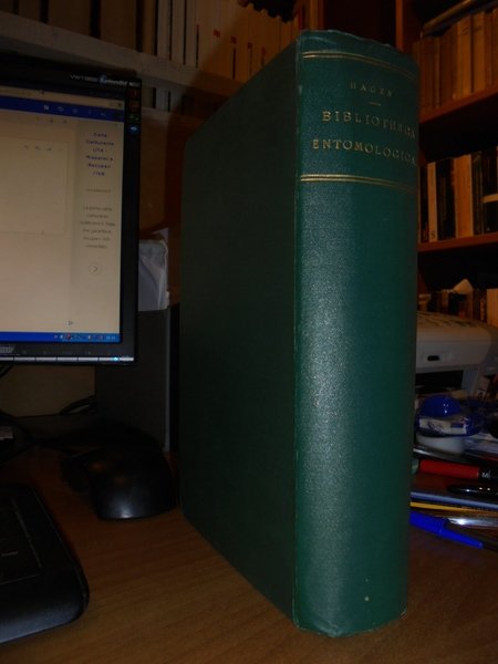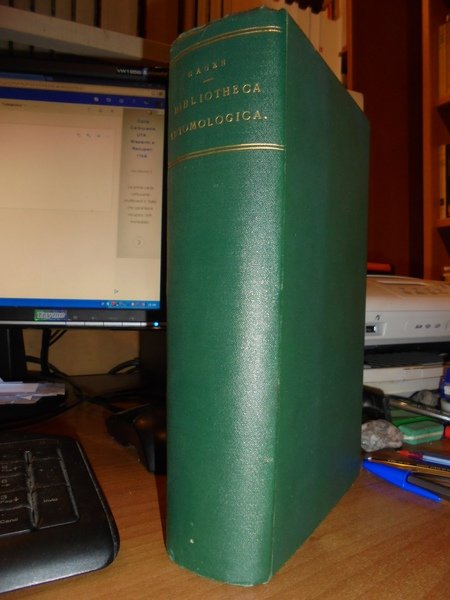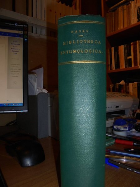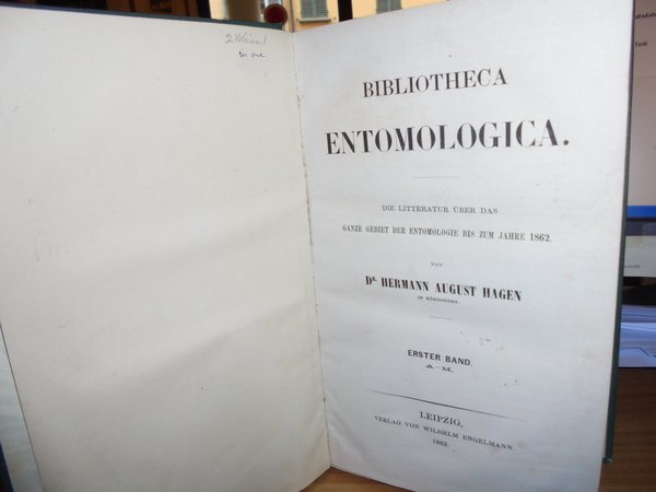 Von Hermann August Hagen. Leipzig, Verlag von Wilhelm Engelmann, 1862. BIBLIOTHECA ENTOMOLOGICA. Die Litteratur uber das ganze gebiet der entomologie bis zum Jahre 1862. 2 volumi in uno in-8°, tela originale con titolo in oro al dorso. xii, 566 pp. 512 pp. In fine allegati 2 opuscoli separati di 16 pp. ciascuno. ex libris al verso del piano anteriore. Ottimo esemplare. Uff. D - I - 2