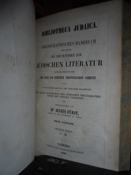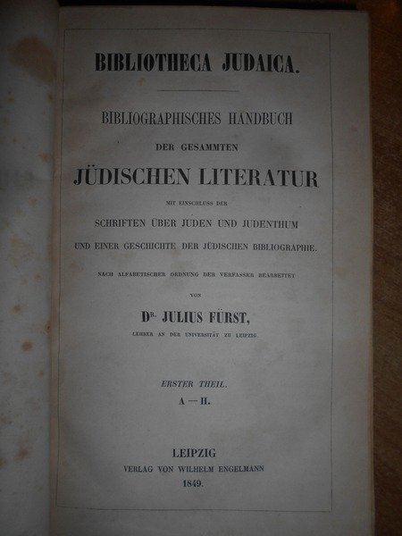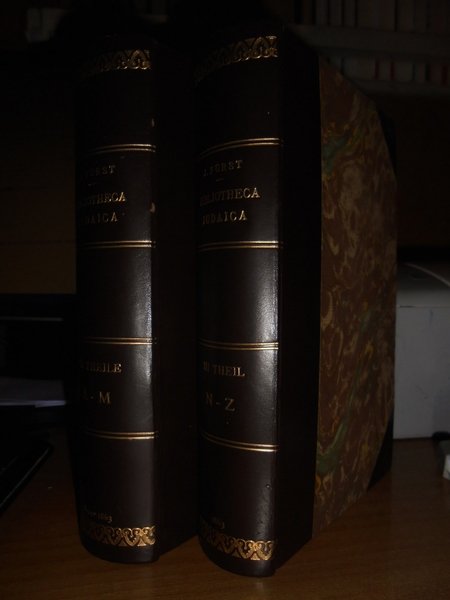 by Julius Fürst. Leipzig, Verlag Von Wilhelm Engelmann, 1849 - 1863. BIBLIOTHECA JUDAICA. Bibliographisches Handbuch der Gesammten jüdischen Literatur mit Einschluss der Schriften Uber Juden und Judenthum. Edizione originale. 2 volumi in-8°, legatura recente in m. pelle con grandi angoli, fregi e titoli in oro ai dorsi, tagli marmorizzati. (viii), 419, 409 pp.; (CIV), 664 pp. Rara prima edizione molto ben conservato. Uff. E - IV - 3