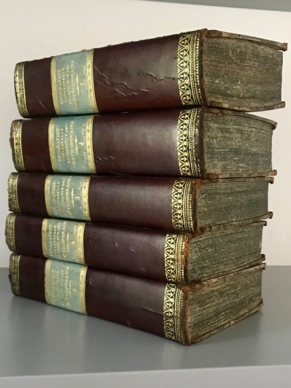 5 volui in-8° (cm. 20), legature coeve in mezza pelle (lievi segni d'usura), titolo in oro su tassello ai dorsi, tagli spruzzati; carte in buono stato, testo su due colonne; leggera brunitura uniforme. Buon esemplare. (NG9)