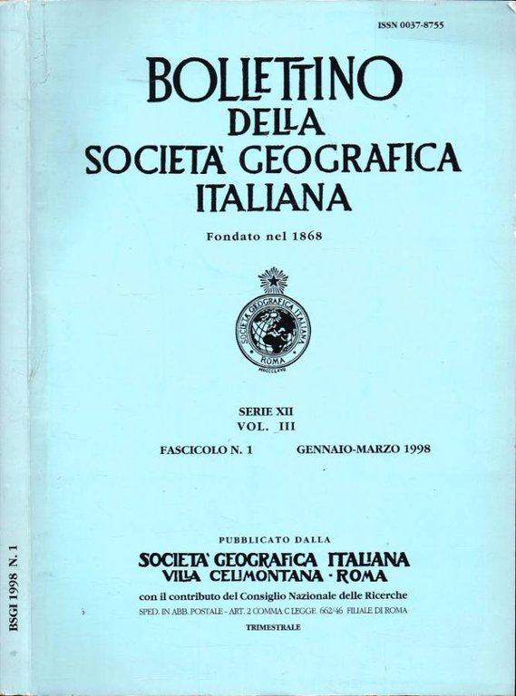 Anno 1998 incompleto, presente Fascicolo N. 1, Gennaio-Marzo, Vol. III del periodico trimestrale Bollettino della Società Geografica Italiana - Fondato nel 1868 - Serie XII. Buono stato coperta illustrata in cartoncino patinato semimorbido, macchietta, cima, piede e punta superiore del piatto anteriore appena sfregati, cerniera stretta, tagli e pagine ottimamente conservati. Presenta testo posto su una e due colonne, cartine e tabelle monocrome. All'interno allegato spillato dal titolo Bollettino della Società Geografica Italiana - Serie XII - Vol. II - Anno CXXX - Vol. CXXXIV dell'intera collezione (1997)", con l'Indice del Vol. II, di XV pagine. Numero Pagine 215
