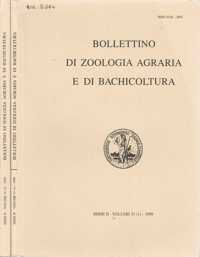 Volume 31 completo, composto da due fascicoli, NN. 1 e 2, anno 1999 del Bollettino di Zoologia Agraria e di Bachicoltura - Serie II, direttore responsabile: L. Suss. Buono stato, coperta in cartoncino goffrato, catalogazione bibliotecaria manoscritta sul margine di testa del piatto anteriore, bordo leggermente sfregato, piega, cerniera stretta, tagli di testa e di piede con macchiette, pagine, in carta patinata, in ottimo stato. Presentano timbro ex biblioteca su frontespizio e sul margine di piede di qualche pagina, N. 1 anche con cifra manoscritta su frontespizio, figure in nero ed in b. e n., in testo e fuori testo, tavole con illustrazioni a colori; in fondo al N. 1 allegato fascicolo contenente l'Indice del Volume 31, pagine non numerate, bordo poco sfregato con ammaccature. Lingue: Italiano, Inglese. Numero Pagine 249, numerazione delle pagine in sequenza