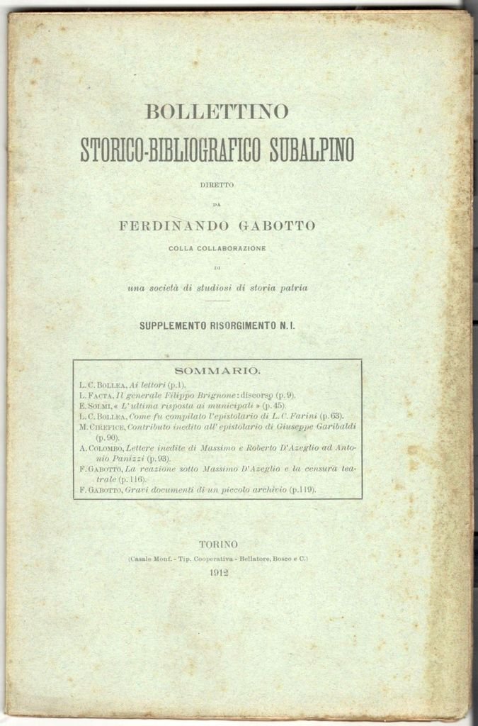 Fascicolo in 8°, pp. 124. Brossura editoriale con indice a stampa. Fioriture alla copertina, per il resto copia in ordine, interamente a fogli chiusi. Fra i vari articoli si segnala: FACTA, L. Il generale Filippo Brugnone. - SOLMI, E. L'ultima risposta ai municipali. - BOLLEA, L. C. Come fu compilato l'epistolario di L. C. Farini. - CIREFICE, M. Contributo inedito all'epistolario di Giuseppe Garibaldi. - COLOMBO, A. Lettere inedite di Massimo e Roberto D'Azeglio ad Antonio Panizzi. - GABOTTO, F. La reazione sotto Massimo d'Azeglio e la censura teatrale.