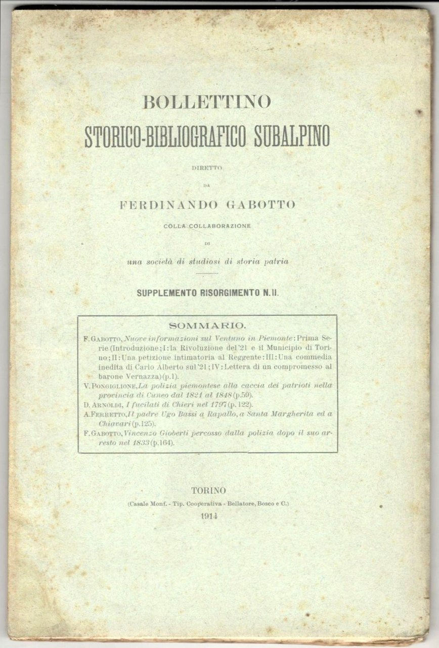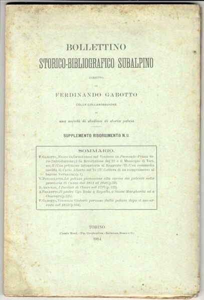 Fascicolo in 8°, pp. 163, (1). Brossura editoriale con indice a stampa. Fioriture alla copertina, per il resto copia in ordine, interamente a fogli chiusi. Fra i vari articoli si segnala: GABOTTO, F. Nuove informazioni sul ventuno in Piemonte. Prima serie. - PONGIGLIONE, V. La polizia piemontese alla caccia dei patrioti della provincia di Cuneo dal 1821 al 1848. - ARNOLDI, D. I fucilati di Chieri nel 1797.