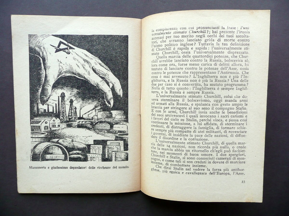A. R. L., Bolscevismo Obbrobrio dell'uomo Vallecchi, Firenze - Roma 1941, cm 18,5x13, pp. 40 con qualche ill. in b/n fuori testo; brossura ed. Condizioni di conservazione Esemplare ben conservato con tracce d'uso, alcune piccole lievi bruniture principalmente alle brossure; angoli della brossura ant. con pressoché trascurabili accenni di pieghette. Interni buoni. Opuscolo propagandistico di netto taglio antirusso ed antibolscevico, edito durante la Seconda Guerra Mondiale. OPEB.3080 N