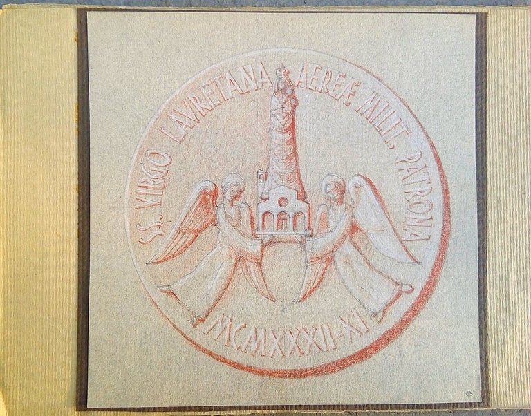 disegno originale per medagliaSS.Virgo Lauretana Patrona Aereae Milit.autore sigla NB in basso a destramisure del foglio cm. 25x35 circain buono statoE 20935 /2