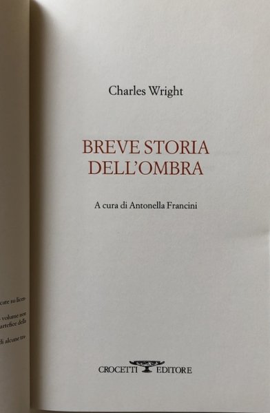 Breve storia dell’ombra, curato e tradotto da Antonella Francini, raccoglie poesie della prima produzione di Wright e alcuni dei suoi ultimi testi disegnando il percorso poetico di una delle voci decisive della poesia anglofona contemporanea.