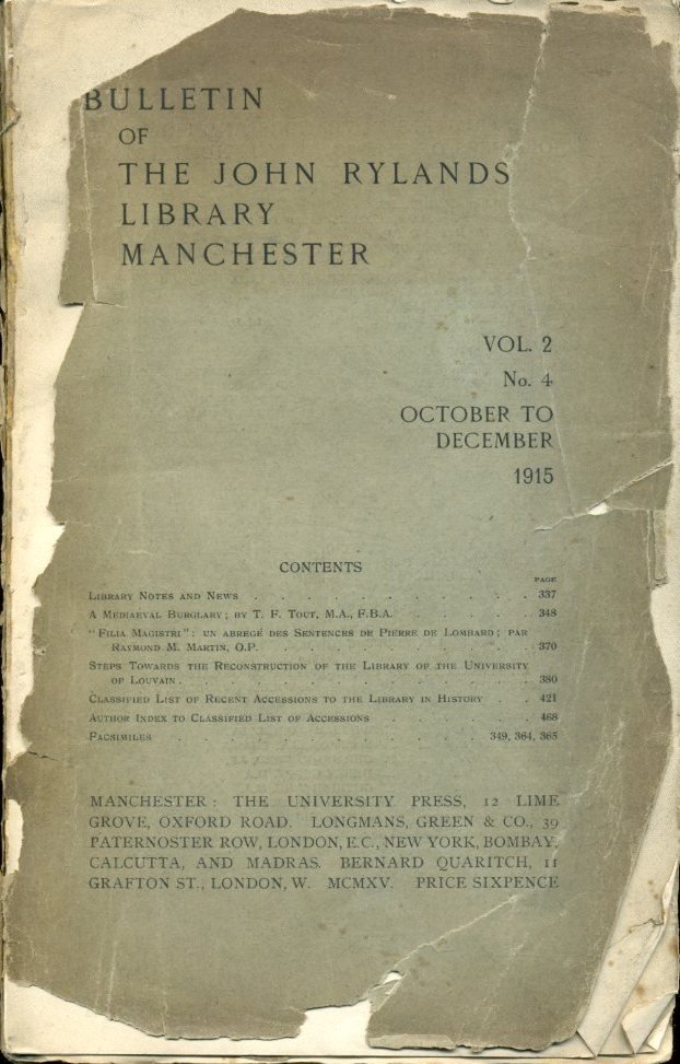 No marks or inscriptions to contents. Covers loose and incomplete. Clean untrimmed pages, some uncut, 148pp. Library notes and news, a medieval burglary, the teacher's daughter (in French), reconstruction of Louvain University library and recent accessions to the John Rylands library. Some text in French.