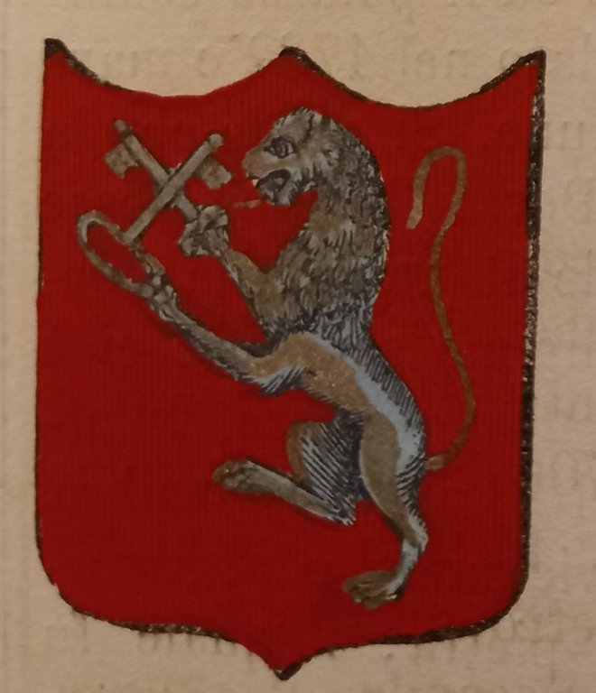 Piccolo stemma comunale colorato a mano d’epoca (cm. 3,8 x 3,2 ca.). Stralcio dal Dizionario Corografico illustrato dell’Italia, edito a Milano nel 1868. Ogni stemma di questa raccolta è inserito in una o più pagine di testo con la descrizione della località, notizie storico - geografiche e statistiche (numero degli abitanti e degli elettori, guarnigioni della Guardia Nazionale, ecc.). Spesso il testo è redatto da studiosi locali o dai sindaci, con maggiori, interessanti notizie.
