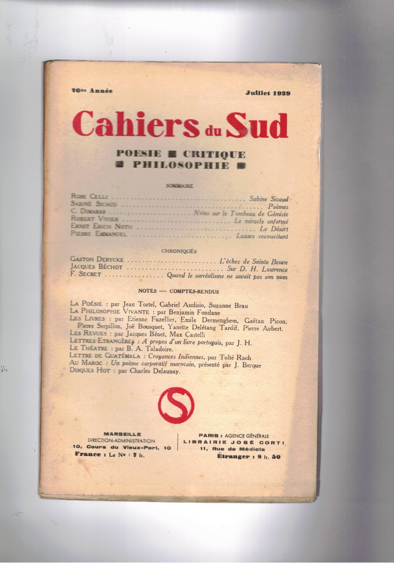 Cahiers du Sud. mensile Poesia, critica filosofia. n° di juillet. 1939. R. Celli Sabine Sicaud; S. Sicaud POèmes; E. E. Noth Le Desert; P. Emmanuel Lazareressuscitent; G. Derycke L'éche de Saint Beuve; J. Béchot Sur D. H. Lawrence; ecc.