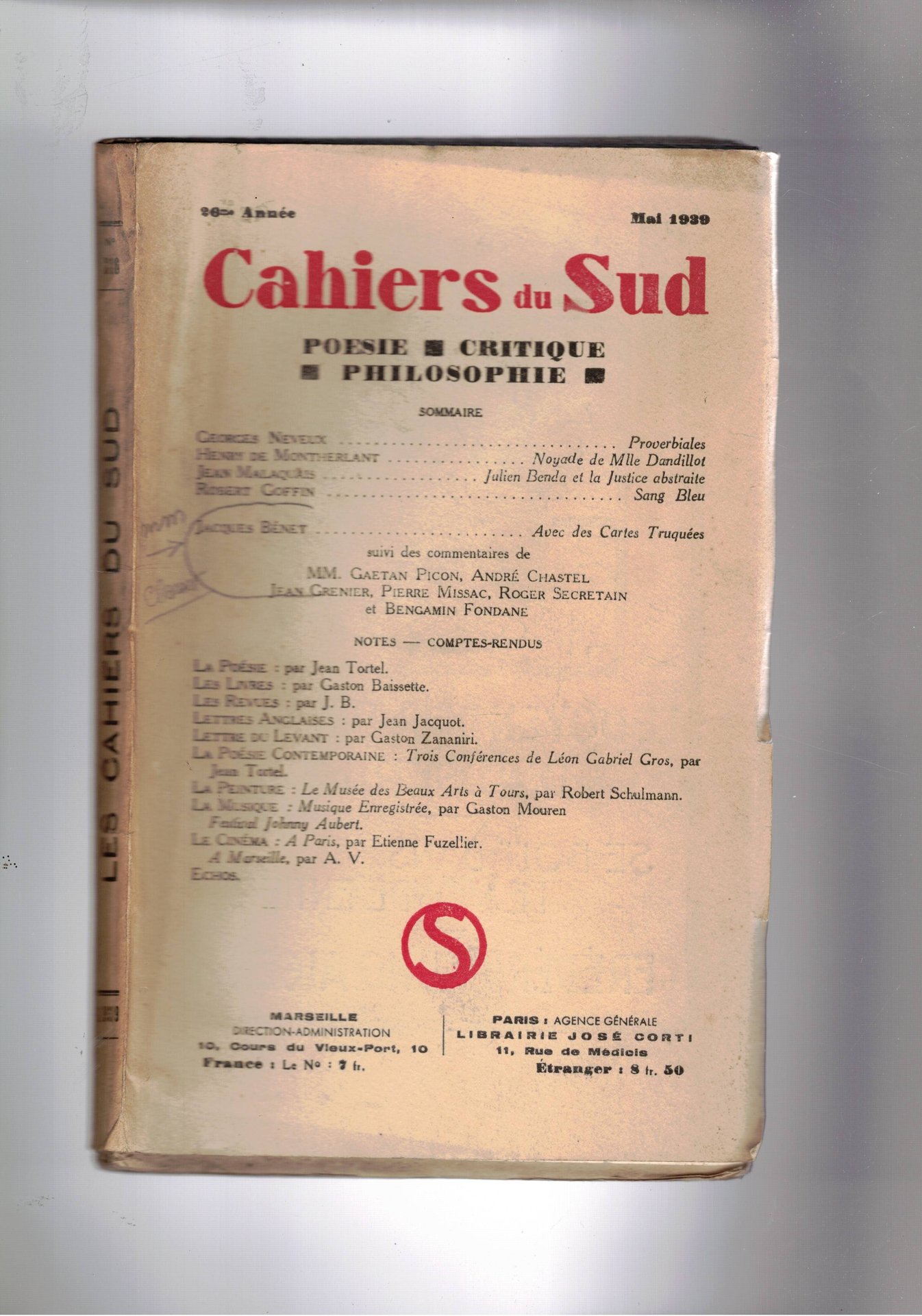 Cahiers du Sud. mensile Poesia, critica filosofia. n° di mai. 1939. J. Benet avec des carte truquées suiv des commentaires de MM. G. Picon, A. Chastel, J. Grebier, P. Missac, R. Secretain, et B. Fondane; ecc.