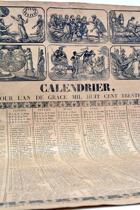 43x53 Cm. Calendrier républicain français pour l'an 1835. Le calendrier républicain est également connu sous le nom de calendrier révolutionnaire français. Il a été créé et utilisé par le gouvernement français pendant environ 12 ans, de la fin de 1793 à 1805, dans le cadre des réformes mises en place pendant la Révolution française. Le calendrier républicain a été conçu pour remplacer l'ancien calendrier grégorien et pour éliminer les références à la religion et à la monarchie. Chaque jour était divisé en dix heures, chaque heure en 100 minutes décimales et chaque minute décimale en 100 secondes décimales. La série de gravures en tête du calendrier montre des scénes de l'histoire de Joseph. Le Livre de la Genèse raconte que Joseph est l'un des douze fils de Jacob et le premier des deux fils (avec Benjamin) de Rachel. Il est vendu en esclavage par ses frères jaloux, mais devient l'homme le plus puissant d'Égypte aux côtés de Pharaon. Petits accrocs sur les bordures. Queqlques petits réparations sur la partie supérieure de la planche.