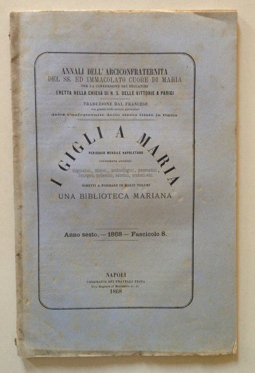 Opuscolo, I Gigli a Maria Camavitto: Le litanie di Cividale" Tip. Fratelli Testa, Napoli 1868, cm 21x17.5, pp da da 113 a 128 (fascicolo 8) e da 347 a 364 (fascicolo 8), all'interno articolo di Camavitto: "Le Litanie di Cividale" (pp 8), 2 tavv. in b/n a p.pag. f.t., br. ed., numero completo. Condizioni di conservazione. Esemplare in buono stato con tracce d'uso e del tempo; brossura editoriale con minime pieghette, strappetti e mancanze ai margini, agli angoli e al dorso; un fascicolo leggermente allentato. Numero completo. OPEB.3179 MT "