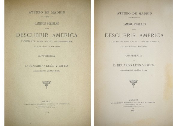 Caminos posibles para descubrir América y causas de haber sido el más improbable, el más rápido y fecundo. Conferencia pronunciada en el Ateneo de Madrid. | Libri antichi e moderni | León Y Ortiz, Eduardo.