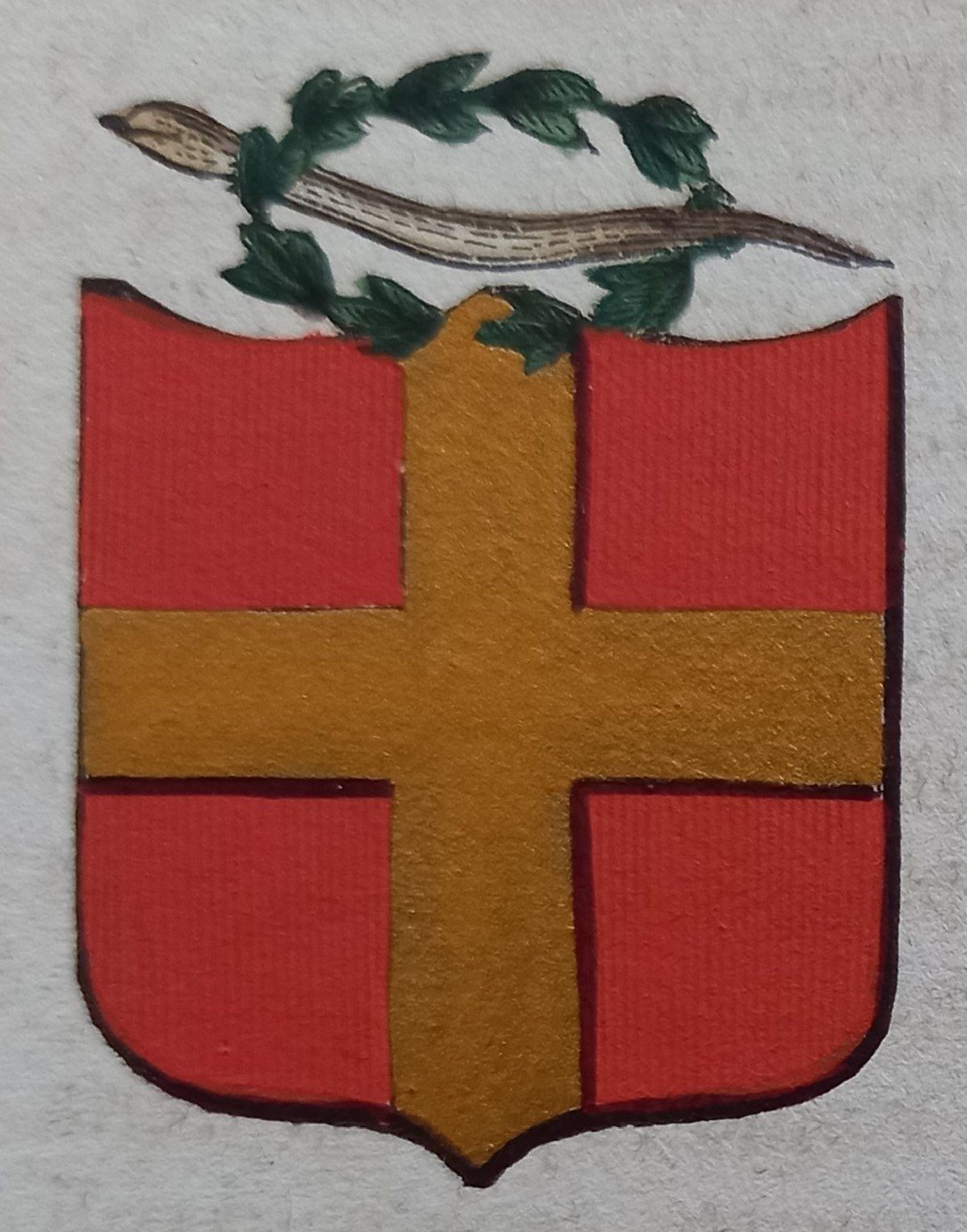 Piccolo stemma comunale colorato a mano d’epoca (cm. 3,8 x 3,2 ca.). Stralcio dal Dizionario Corografico illustrato dell’Italia, edito a Milano nel 1868. Ogni stemma di questa raccolta è inserito in una o più pagine di testo con la descrizione della località, notizie storico - geografiche e statistiche (numero degli abitanti e degli elettori, guarnigioni della Guardia Nazionale, ecc.). Spesso il testo è redatto da studiosi locali o dai sindaci, con maggiori, interessanti notizie.