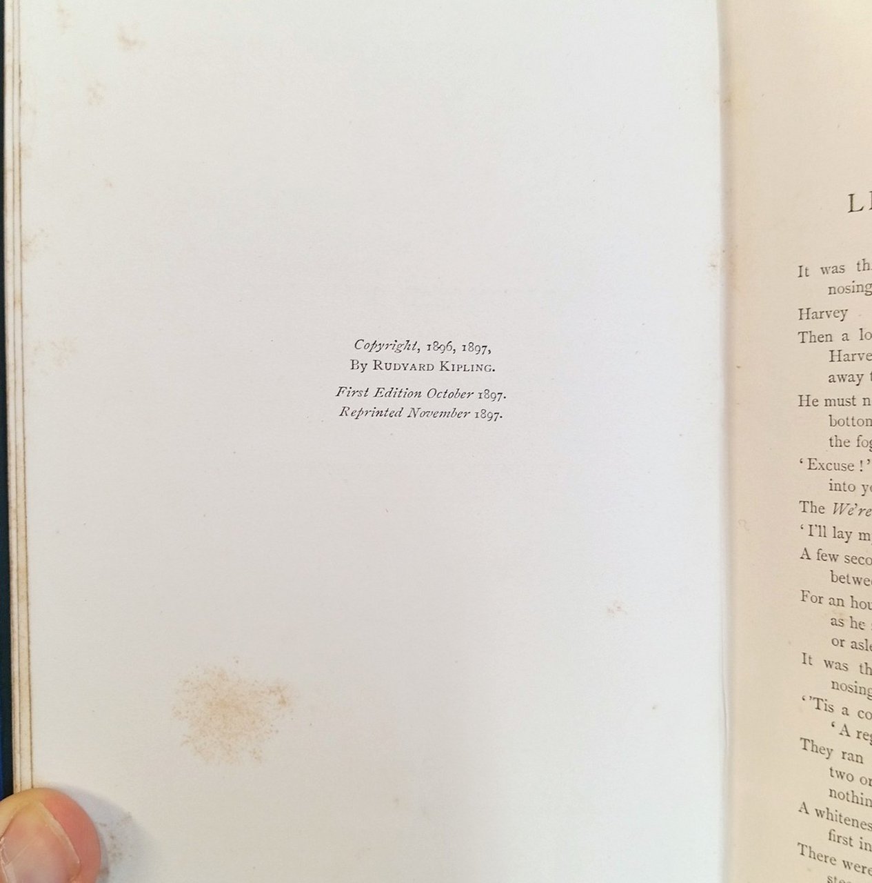 Prima ristampa della prima edizione inglese di ''Capitani coraggiosi'', di un solo mese successiva all'originale / First reprint of the first edition, only a month later than the original - Volume nella sua legatura editoriale in tela blu con titoli e belle decorazioni in oro al piatto e al dorso, tagli dipinti in oro, viii-245 pagine con illustrazioni originali in nero di I. W. Taber fuori testo. Leggere fioriture alle carte, nel complesso esemplare in buone-ottime condizioni di una pregevole edizione da collezione.