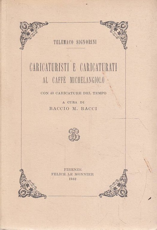 Brossura, 11,5x17 cm, 196 pg. con 48 caricature del tempo. A cura di Baccio M. Bacci. Ritratto dell'autore in antiporta. Sovracoperta anteriore illustrata conservata all'interno del volume. Ottime condizioni.