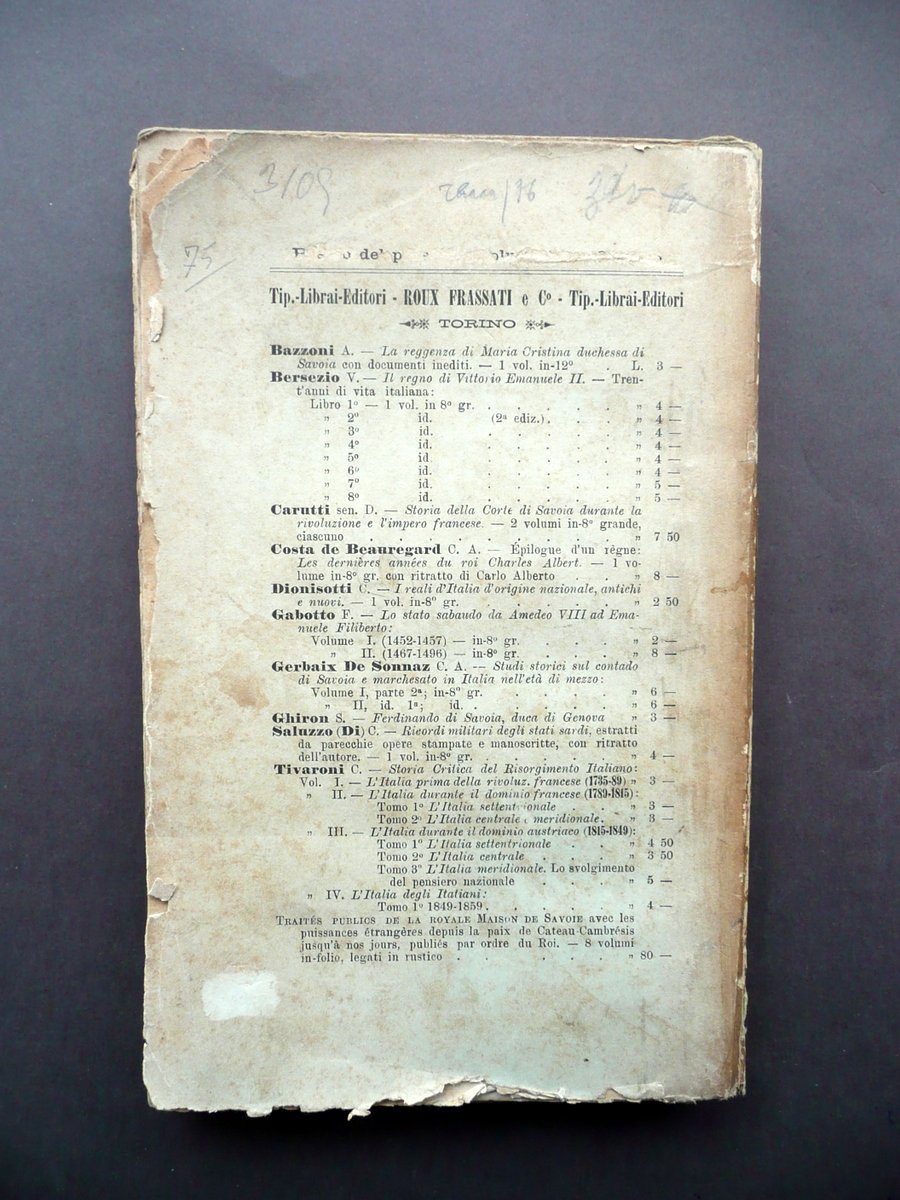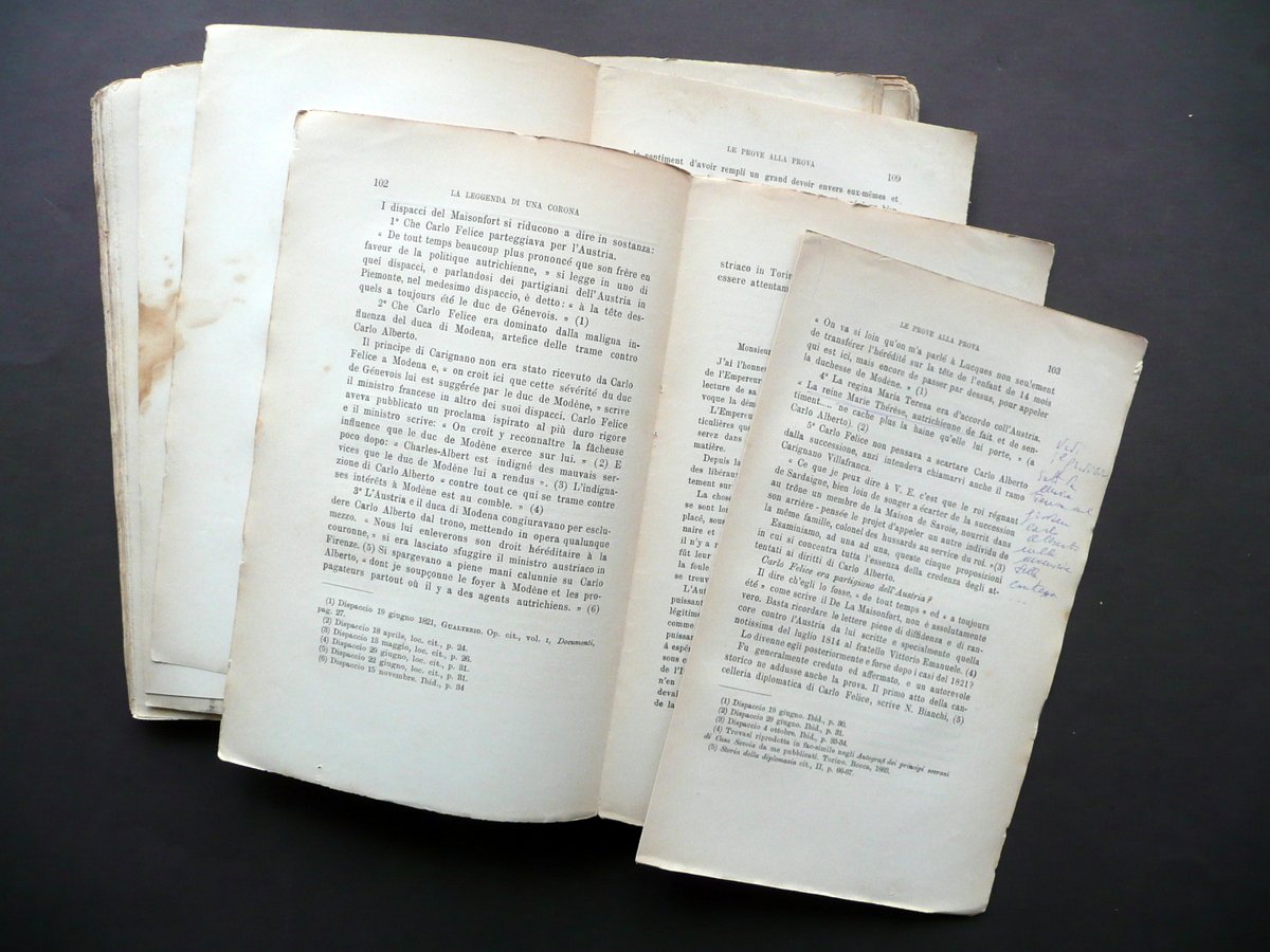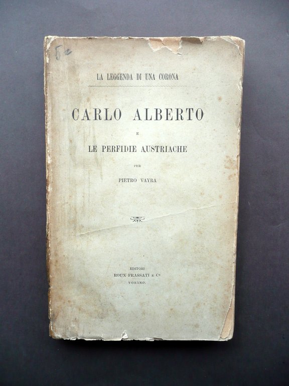 Pietro Vayra, La leggenda di una corona - Carlo Alberto e Le perfide austriache Roux Frassati e C., Torino 1896, cm 22,5x14,5, pp. [4]; 264; brossura ed. Condizioni di conservazione Esemplare in condizioni pi√π che discrete con tracce d'uso e alcune piccole lievi bruniture; brossure precedentemente staccate dal corpo del testo ma riapplicate per mezzo d'incollatura, con qualche leggero alone, alcuni minimi strappetti e qualche piccola mancanza ai margini e agli angoli; margini sup. delle brossure con qualche annotazione d'epoca a matita; dorso con applicata etichetta dattiloscritta recante il titolo e con qualche minima abrasione. Interni buoni con lievi accenni d'ingiallimento a qualche pagina; poche pagine con una vecchia annotazione e/o qualche sottolineatura a penna; margine est. delle pp. 97-102 con una piccola leggera gora che non interessa il testo; pp. 99-110 staccate dal corpo del testo (vedi foto). SETT117.L11165 N