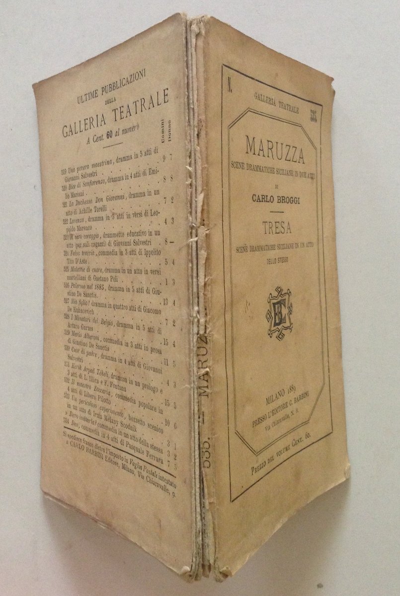 Carlo Broggi, Maruzza Scene drammatiche siciliane in due atti ------------------------------------------ Tresa Scene drammatiche siciliane in un atto Editore Barbini, Milano 1889; cm 16x10, pp. 72; scene drammatiche siciliane; br. ed. Condizioni di conservazione. Esemplare ben conservato con leggere tracce d'uso e del tempo; brossura editoriale con qualche pieghetta e una minima mancanza all'angolo superiore; interni con qualche annotazione e sottolineatura a penna e a matita colorata; dorso fessurato, qualche fascicolo leggermente allentato. OPEB.3460 MT