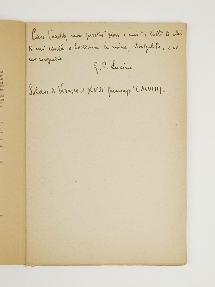 LIBROEdizione originale.CON AUTOGRAFO.Ottimo esemplare pregiato da bella dedica autografa dell’autore al giornalista e scrittore ligure Alessandro Varaldo.Composto probabilmente tra il 30 dicembre 1908 e il 12 gennaio 1909, questo carme luciniano - carico di rimandi foscoliani e dai toni classicheggianti - venne composto con intento di solenne denuncia all’indomani del terribile terremoto che colpì Messina e Reggio Calabria il 28 dicembre 1908. Pubblicato a cura della Rassegna Internazionale “Poesia”, in copertina riporta l’indicazione «a totale beneficio dei superstiti al disastro nazionale».Cammarota, Futurismo, 287.3