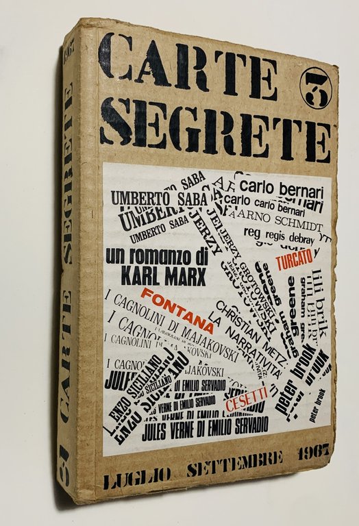 I ed.. anno I - LUGLIO-SETTEMBRE 1967 - n. 3 della rivista trimestrale di lettere e arti (Direzione, redazione, amministrazione: Roma, Via di Ripetta, 67). VIII piccolo/ 256/ rilegatura in cartone grezzo con titoli in nero e rosso e tassello in carta bianca applicato al primo piatto con i contenuti salienti della rivista in nero e rosso di cadmio (copertina di Nuvolo). Con illustrazioni in b/n f.t. (anche pubblicitarie). Stampa a cura di Fausto Fiordelli. Sommario: Carte segrete (CHRISTIAN METZ: La narratività (Traduzione di Renzo Paris) - REGIS DEBRAY: L'intellettuale militante - GRAHAM GREENE: Il corrispondente di guerriglia - ROBERT CREELEY, EDWARD DORN, MAX FINSTEIN, BOB KAUFMAN, FRANK O'HARA, CHARLES OLSON, M.L. ROSENTHAL, ED SANDERS, ARAM SAROYAN, MIKE SILVERTON, JACK SPICER, PHILIP WHALEN: Undergrounds Poems (Le poesie del sottosuolo). Presentazione etraduzione di Dacia Maraini - ARNO SCHMIDT: Tina o della immortalità (Presentazione, note e traduzione di Maria Teresa Mandalari) - ERNST KRAWEHL: Le trappole linguistiche schmidtiane - VLADIMIR MAJAKOVSKI: Le lettere del Cucciolo di Vladimir Majakovski a Lili Brik (Traduzione e note di Laura Zoffoli Boffa) - KAREL CAPEK: Un caso giudiziario (Traduzione di Soldanella Dandova) - KARL MARX: Scorpion e Felix (Presentazione di Fausto Codino, traduzione di Giovanna Kormis) - CARLO BERNARI: Omaggio a Saba - ENZO SICILIANO: Basia (1956-1966) - JULES VERNE: Lettere sull'amore e sul matrimonio al padre e alla madre (con un saggio di Emilio Servadio) - MILAN FÜST: Tre poesie (Traduzione di Marinka Dallos Toti, Eva Toth e Maria Lourdes Arconada)) - Carte scoperte (Tecnica narrativa dei filacteri; di Claude Moliterni - Il teartro come laboratorio e centro di ricerche; di Peter Brook - Il metodo Grotowski; di Jerzy Grotowski e Ludwik Flaszen - Loin du Vietnam; di Michel Ciment _ Dal bacio al nudo nel cinema jugoslavo - Robert Bresson - Tasca interna dell'avvocato del diavolo: Rivoluzioni e controrivoluzioni culturali - I premi David a La Habana - Chi sarà stato mai I. S. Wollmann? - Arrabal dentro e fuori di prigione - I Disoccupati di Brecht - I Cine-Vietnam; un autografo di J. L. Godard - Metaletteratura 2: Metapoesia - Le sventurose gesta del Poeta contumace in sei puntate - Jean Arp - Butor e Zola - Dopo Camus Desnos - Il silenzio di Pound) - Illustrazioni (LUCIO FONTANA (Presentazione di Marco Valsecchi, Raffaele Carrieri, Michel Tapié) - ANTONIO CORPORA - Francesca Chandon - CARLO QUATTRUCCI - JAMES MORGAN - DAVID LEVINE - JOSEF CAPEK - RODTCHENKO - ÉMILE BAYARD - GIULIO TURCATO - GIUSEPPE CESETTI (Presentazione di Antonio Ettore Russo) - ALAIN TERCINTET - Copertina di NUVOLO).