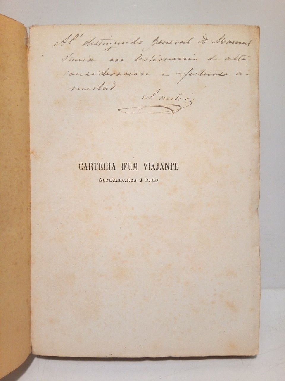[PRIMERA EDICION].- Lisboa: Typographia Universal, 1878.- XIII p., [1 h.], 347 p., [1 h.]; 8º (18,5 X 13 cm); intons; Texto en portugués; Rústica Ed.- Interesante y ameno relato de un viaje por diversas partes de Europa. MUY RARO.* Dedicatoria autógrafa del autor en la portadilla: "Al distinguido General D. Manuel Pavía en testimonio de alta consideración en afectuosa amistad. El Autor". Las cubiertas jaspeadas con motitas de óxido de tenue intensidad, faltándole a la posterior un trocito de la esquina inferior externa, que ha sido restaurada. Interior perfecto. PORTUGAL