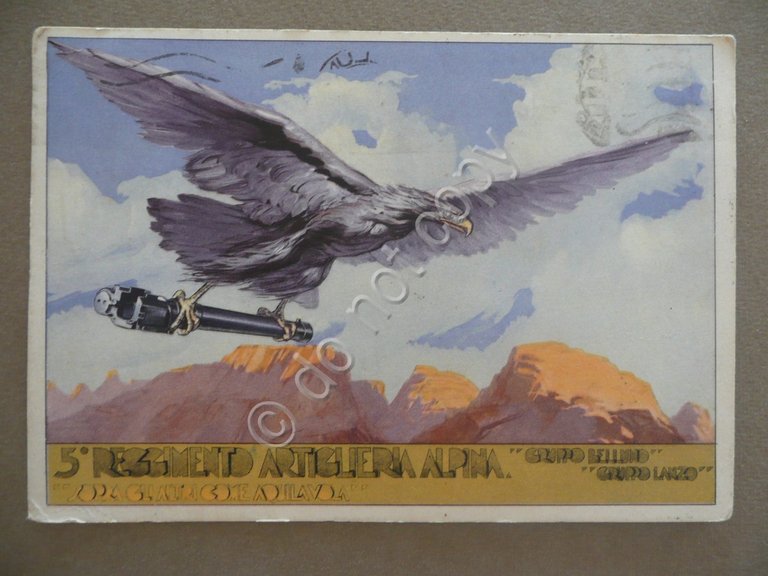 Cartolina, 5° Reggimento Artiglieria Alpina - Gruppo Belluno - - Gruppo Lanzo - Sopra gli altri come aquila vola" Ediz. d'Arte Boeri, Roma, 1939; 10,7x15,2 cm., cartolina ill. a colori, viaggiata. Condizioni di conservazione Cartolina in buono stato di conservazione con leggere tracce d'uso ai bordi, angoli leggermente arrotondati. CART.0580 MT "