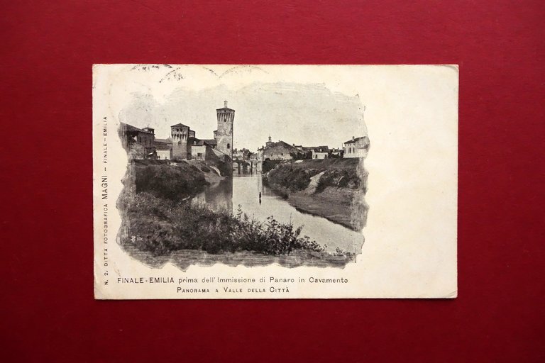 Cartolina, Finale Emilia prima dell'immissione di Panaro in Cavamento panorama a valle della città Ditta Fotografica Magni - Finale Emilia 1912; cartolina originale ill. in b/n. Viaggiata. Cm 9x14. Condizioni di conservazione buone condizioni con minuscoli difetti agli angoli e lievi segni del tempo, leggerissime poco visibili bruniture. Per ulteriori dettagli vedi foto. CART.3419 N