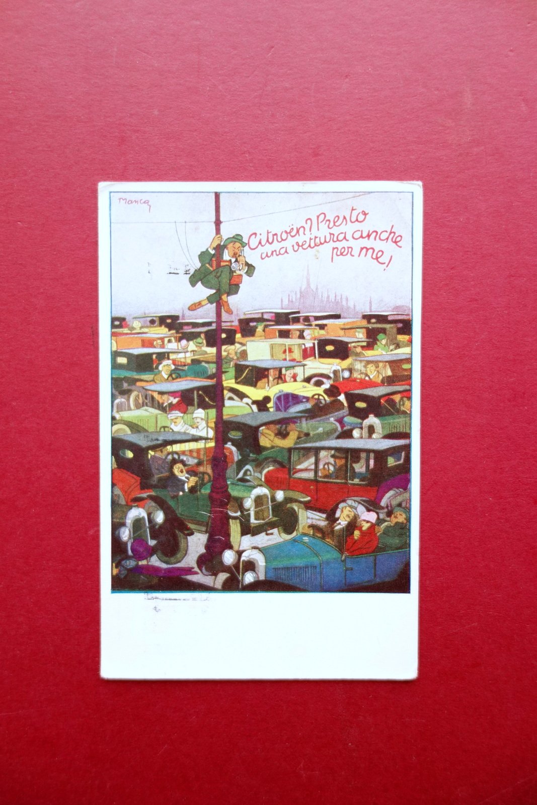 Cartolina originale, Citroen? presto, una vettura anche per me!" - Società Anonima italiana Automobili Citroen - Milano Arti Grafiche Morandini & Soler - Milano 1927; cartolina originale con bella grafica a colori firmata Manca. Viaggiata. Cm 14x9. Condizioni di conservazione Cartolina ben conservata con trascurabili difetti agli angoli, angolo superiore destro con una leggerissima traccia di piccola pieghetta, poche minuscole bruniture. Per maggiori dettagli vedi foto. CART.2714 N "