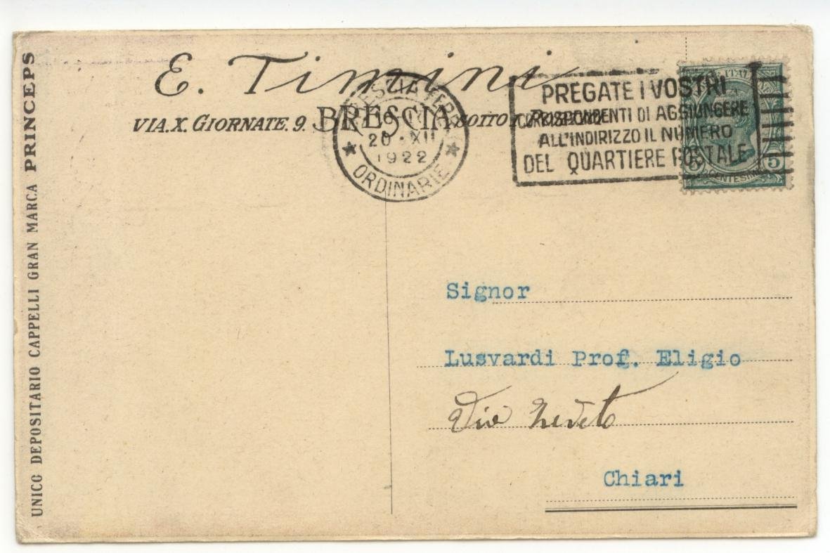 Cartolina originale, E. Timini Le Pi√π Eleganti Calzature I Migliori Cappelli Camiceria Maglieria 1922; cartolina originale ill. a col. Cm 14,5x9,5; Viaggiata. Condizioni di conservazione Cartolina ben conservata. Leggermente ondulata (vedi foto). CART.2404G