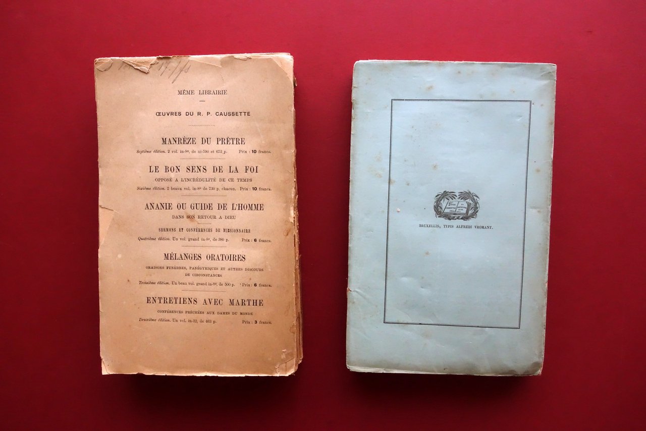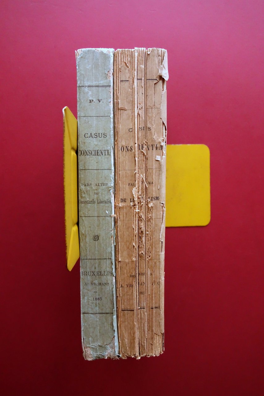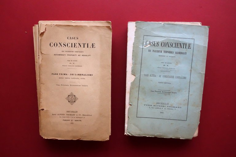 P. V., Casus Conscientiae his praesertim temporibus accomodati propositi ac resoluti cura et studio P. V. moralis theologiae professoris - pars prima: de liberalismo editio tertia castigata, acuta - pars altera: de consectariis liberalismi editio secunda Apud Alfred Vromant & C., Bruxellis 1885-1895; cm 23x14,5; pp. 424 (pars prima); pp. 392 (pars altera); testo in latino. Brossura ed. d'attesa. Due volumi. All'antiporta e ai risguardi di entrambi i volumi timbretti di vecchia biblioteca, esemplare regolarmente annullato e scaricato. Condizioni di conservazione Condizioni discrete con segni del tempo; leggero foxing e ingiallimento delle pagine e brossure; primo volume con fessurazioni e mancanze al dorso, con conseguente sfascicolazione in pi√π parti; brossure ant. di entrambi i volumi staccate dal corpo del testo, con qualche piccola marginale mancanza e taglietto. Interni parzialmente ancora intonsi (volumi poco sfogliati). Un classico del pensiero cattolico antimodernista. Testo in latino. Due volumi. SETT15.L26257 N