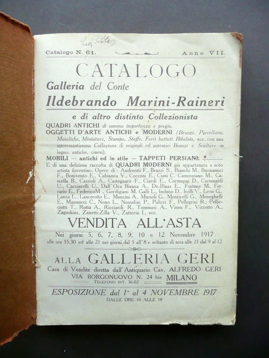 Catalogo Galleria Conte Marini Raineri Roma Vendita Milano Geri 1917 Arte