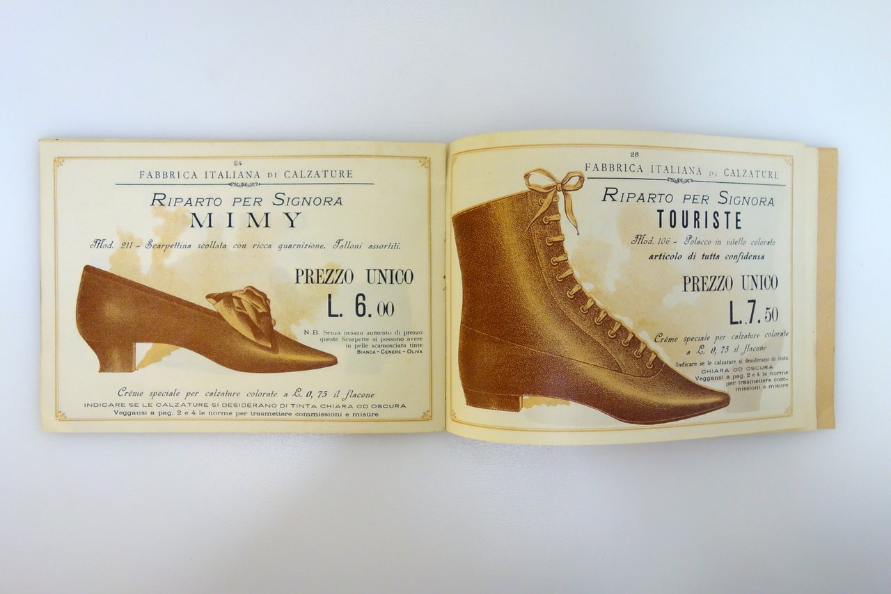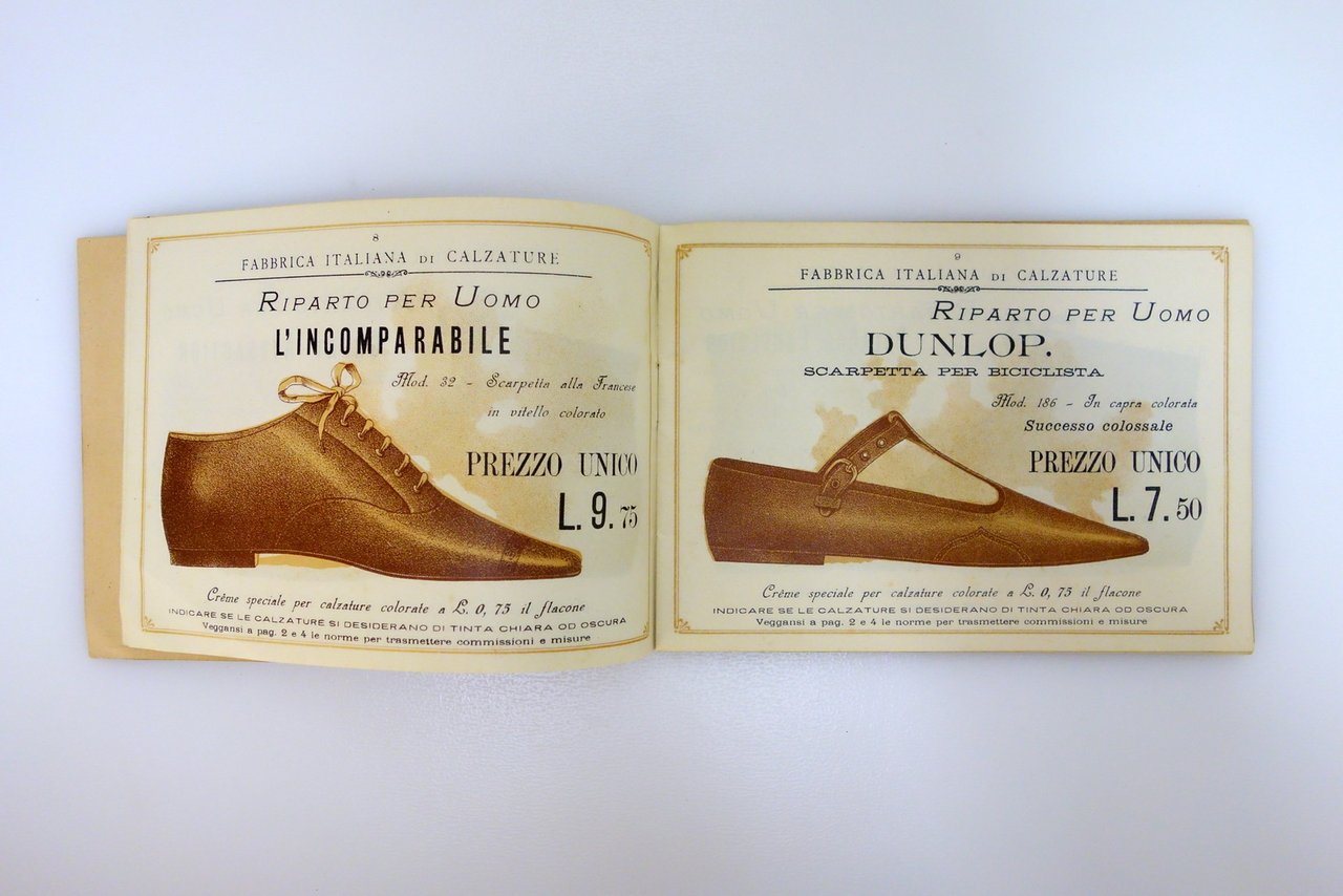 Stab. Lit. A. Ripalta, Milano, 1898; cm 13,5x19; pp. 32 tutte con belle ill. in b/n o seppiate di calzature; brossura ed. con bella grafica cromolitografica.