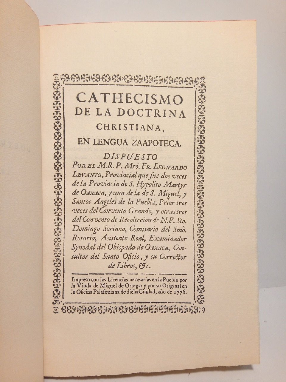 Cathecismo de la Doctrina Christiana, en lengua zaapoteca / Dispuesto por el M.R.P. Mró. Fr. Leonardo Levanto, Provincial que fue dos veces de la Provincia de S. Hypolito Martyr de Oxaca, y una de las de S. Miguel, y Santos Angeles de la Puebla, Prior tres veces del Convento Grande, y otras tres del Convento de Recoleccion de N.P. Sto. Domingo Soriano, Comisario del Smò. Rosario, Asistente Real, Examunador Synodal del Obispado de Oxaca, Consultor del Santo Oficio, y su Corrector de Libros, etc. (Al final observaciones críticas sobre este catecismo, por Eduardo Juliá Martínez)
