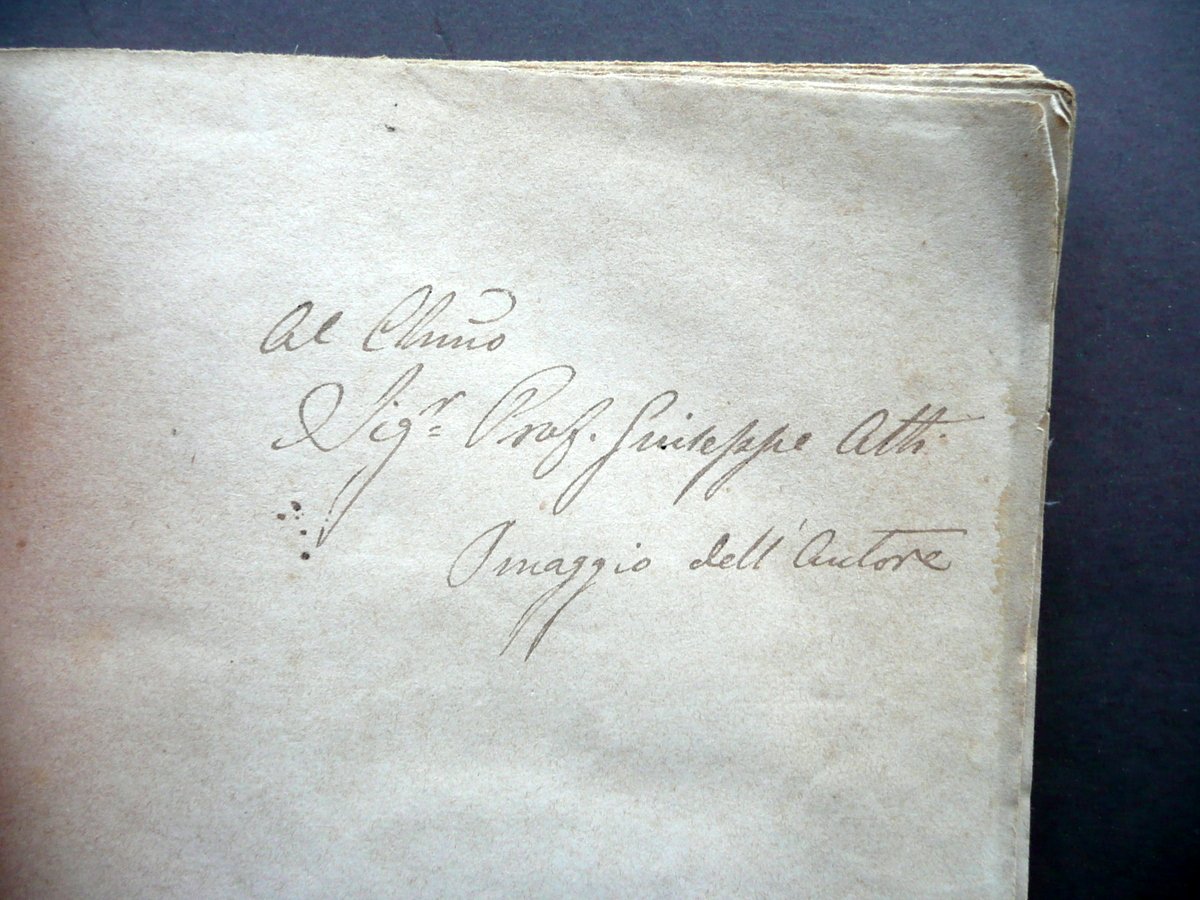 Antonio Orsini, † Cenni biografici degli Illustri Centesi Tip. Lanzoni - Soffritti, Cento 1880, cm 20,5x15, pp. 160; brossura ed. Brossura ant. con vecchia etichetta manoscritta applicata (vedi foto). Prima bianca con dedica autografa dell'autore (firmato L'Autore"). † Condizioni di conservazione Esemplare in discrete condizioni con tracce d'uso e del tempo; alcune piccole leggerissime bruniture; brossure con qualche strappetto e poche circoscritte mancanze; alcune leggere tracce di vecchia umidit‡ che interessano in misura lieve e decrescente qualcuna delle prime e ultime pagine, senza compromettere la lettura del testo; dorso con qualche parziale fessurazione, alcuni piccoli strappetti e mancanze. Interni con lievi accenni d'ingiallimento del tempo; pagina 16 con integrazione manoscritta del precedente proprietario, redatta su foglio in carta applicato al margine interno (vedi foto). † Edizione originale, molto rara. Margine superiore della prima bianca con dedica autografa dell'autore (firmata "l'autore"). Condizioni come da foto e da descrizione. † SETT126.L12375 N P "